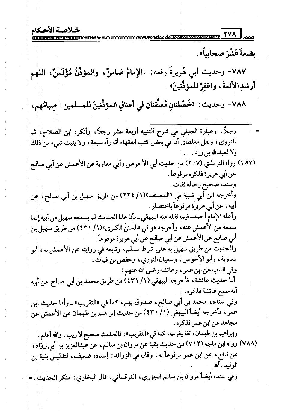 787 - وَحَدِيث أبي هُرَيْرَة رَفعه: " الإِمَام ضَامِن، والمؤذن مؤتمن، اللَّهُمَّ أرشد الْأَئِمَّة، واغفر للمؤذنين ".