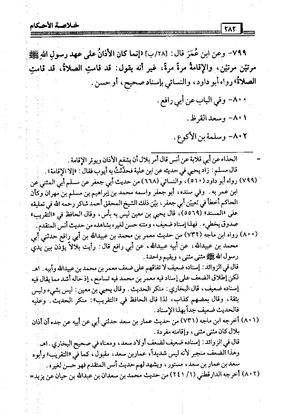799 - وَعَن ابْن عمر قَالَ: [28 / ب] " إِنَّمَا كَانَ الْأَذَان عَلَى عهد رَسُول الله صَلَّى اللَّهُ عَلَيْهِ وَسَلَّم َ مرَّتَيْنِ مرَّتَيْنِ، وَالْإِقَامَة مرّة مرّة، غير أَنه يَقُول: قد قَامَت الصَّلَاة، قد قَامَت الصَّلَاة " رَوَاهُ أَبُو دَاوُد، وَالنَّسَائِيّ بِإِسْنَاد صَحِيح، أَو حسن.