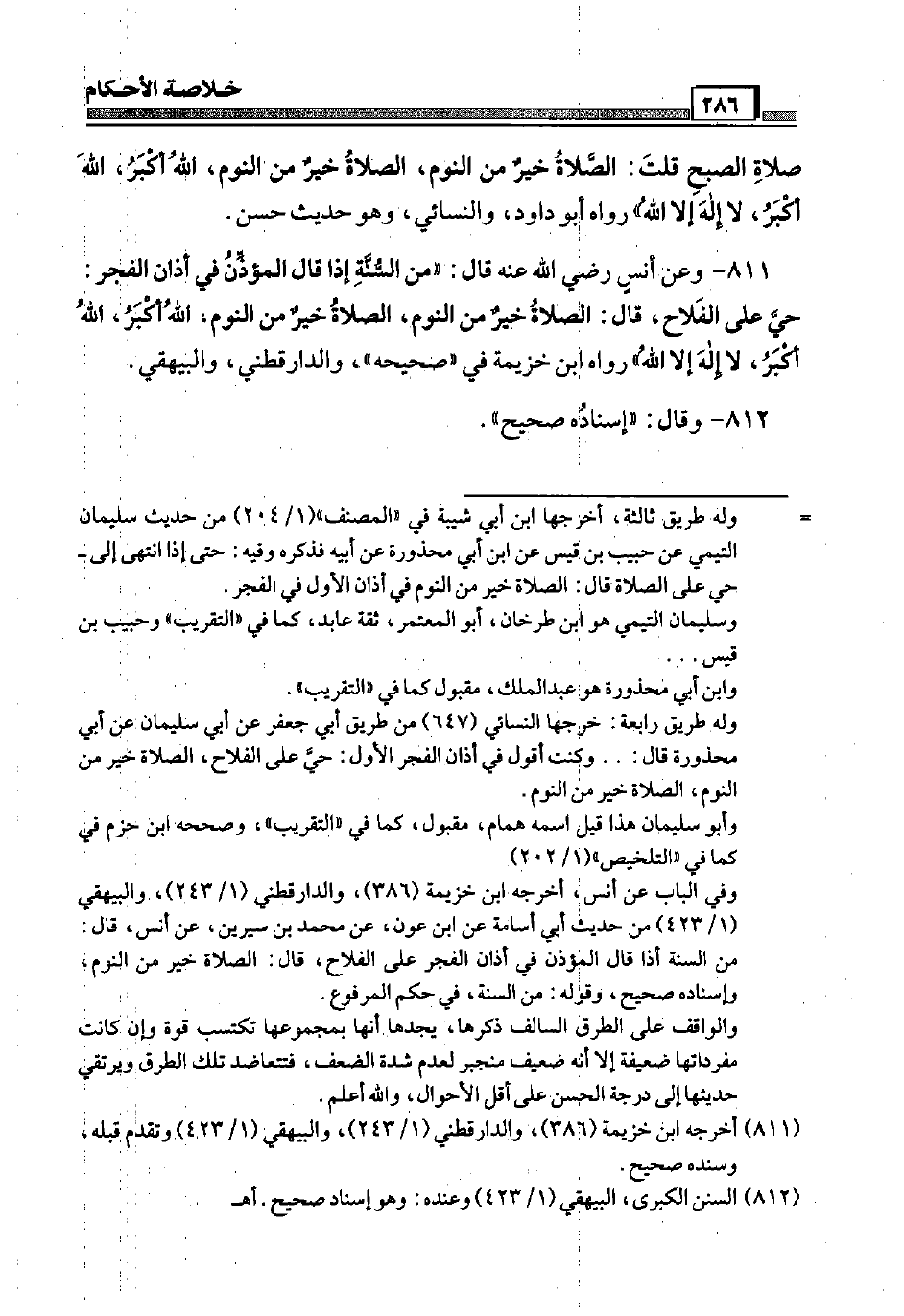 811 - وَعَن أنس رَضِيَ اللَّهُ عَنْه قَالَ: " من السّنة إِذا قَالَ الْمُؤَذّن فِي أَذَان الْفجْر: حَيّ عَلَى الْفَلاح، قَالَ: الصَّلَاة خير من النّوم، الصَّلَاة خير من النّوم، الله أكبر، الله أكبر، لَا إِلَه إِلَّا الله " رَوَاهُ ابْن خُزَيْمَة فِي " صَحِيحه "، وَالدَّارَقُطْنِيّ، وَالْبَيْهَقِيّ.