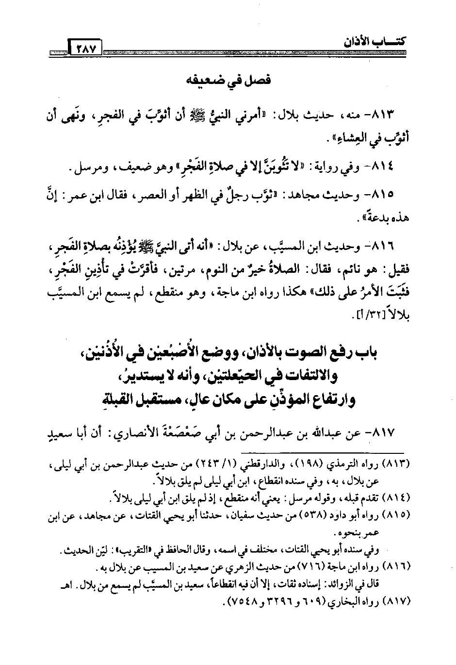 813 - مِنْهُ، حَدِيث بِلَال: " أَمرنِي النَّبِي صَلَّى اللَّهُ عَلَيْهِ وَسَلَّم َ أَن أثوب فِي الْفجْر، وَنَهَى أَن أثوب فِي الْعشَاء ".