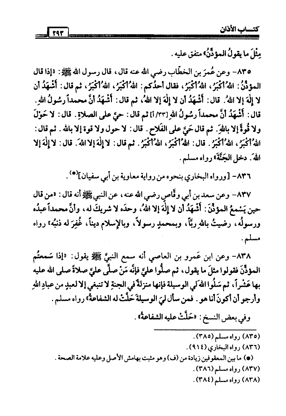 835 - وَعَن عمر بن الْخطاب رَضِيَ اللَّهُ عَنْه قَالَ، قَالَ رَسُول الله صَلَّى اللَّهُ عَلَيْهِ وَسَلَّم َ: إِذا قَالَ الْمُؤَذّن: الله أكبر، الله أكبر، فَقَالَ أحدكُم: الله أكبر، الله أكبر، ثمَّ قَالَ: أشهد أَن لَا إِلَه إِلَّا الله. قَالَ: أشهد أَن لَا إِلَه إِلَّا الله، ثمَّ قَالَ: أشهد أَن مُحَمَّدًا رَسُول الله. قَالَ: أشهد أَن مُحَمَّدًا رَسُول الله [33 / أ] ثمَّ قَالَ: حَيّ عَلَى الصَّلَاة. قَالَ: لَا حول وَلَا قُوَّة إِلَّا بِاللَّه. ثمَّ قَالَ حَيّ عَلَى الْفَلاح. قَالَ: لَا حول وَلَا قُوَّة إِلَّا بِاللَّه. ثمَّ قَالَ: الله أكبر، الله أكبر. قَالَ: الله أكبر، الله أكبر. ثمَّ قَالَ: لَا إِلَه إِلَّا الله. قَالَ: لَا إِلَه إِلَّا الله. دخل الْجنَّة " رَوَاهُ مُسلم.