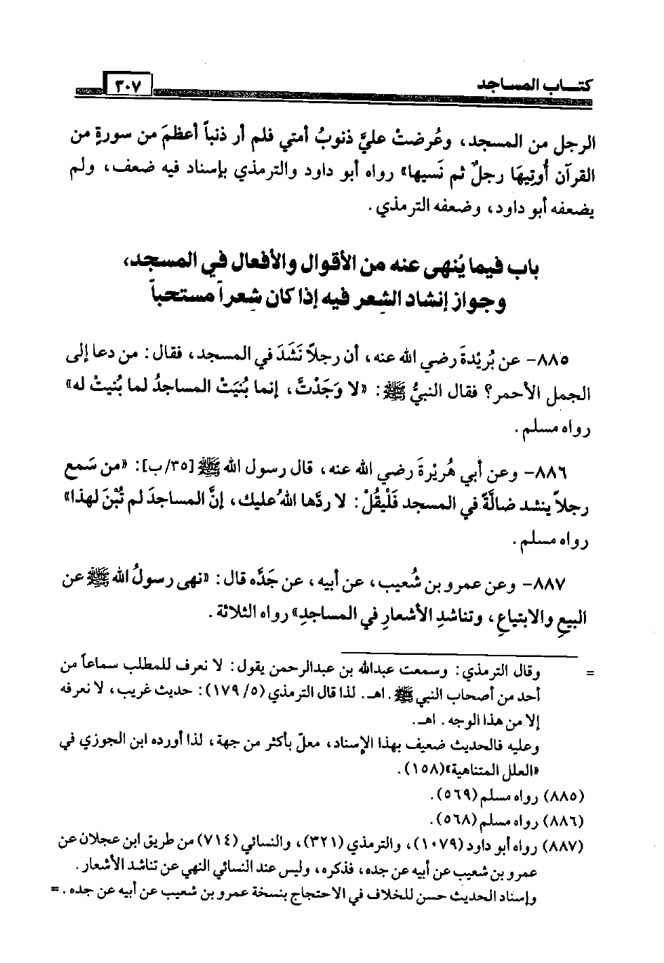 887 - وَعَن عَمْرو بن شُعَيْب، عَن أَبِيه، عَن جده قَالَ: " نهَى رَسُول الله صَلَّى اللَّهُ عَلَيْهِ وَسَلَّم َ عَن البيع والابتياع، وتناشد الْأَشْعَار فِي الْمَسَاجِد " رَوَاهُ الثَّلَاثَة.