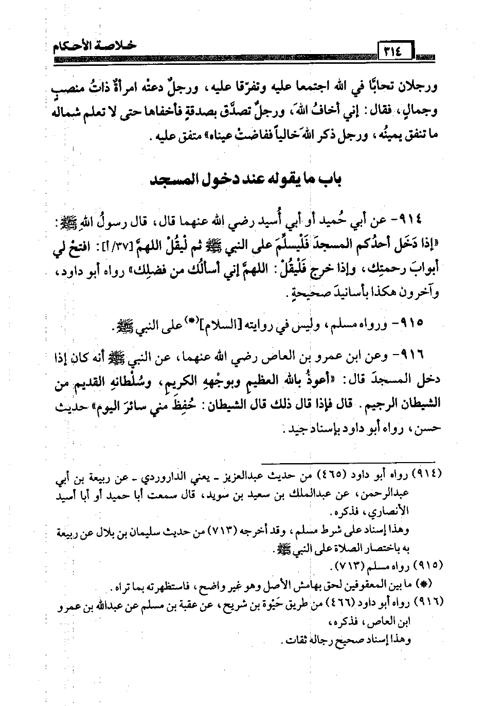 914 - عَن أبي حميد أَو أبي أُسيد رَضِيَ اللَّهُ عَنْهما قَالَ، قَالَ رَسُول الله صَلَّى اللَّهُ عَلَيْهِ وَسَلَّم َ: " إِذا دخل أحدكُم الْمَسْجِد فليسلم عَلَى النَّبِي صَلَّى اللَّهُ عَلَيْهِ وَسَلَّم َ ثمَّ ليقل اللَّهُمَّ [37 / أ] : افْتَحْ لي أَبْوَاب رحمتك، وَإِذا خرج فَلْيقل: اللَّهُمَّ إِنِّي أَسأَلك من فضلك " رَوَاهُ أَبُو دَاوُد، وَآخَرُونَ هَكَذَا بأسانيد صَحِيحَة.