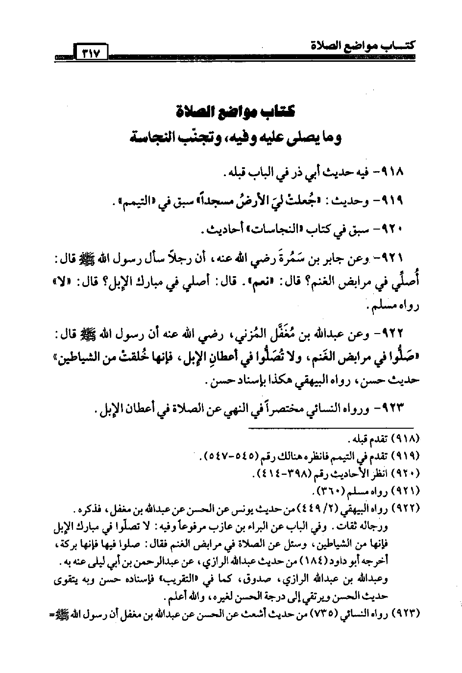 923 - وَرَوَاهُ النَّسَائِيّ مُخْتَصرا فِي النَّهْي عَن الصَّلَاة فِي أعطان الْإِبِل.