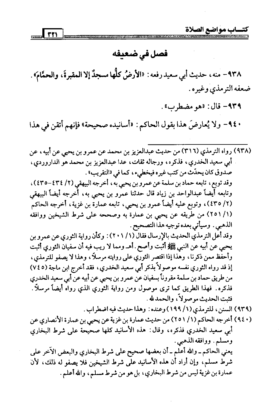 938 - مِنْهُ، حَدِيث أبي سعيد رَفعه: " الأَرْض كلهَا مَسْجِد إِلَّا الْمقْبرَة، والحمّام ". ضعفه التِّرْمِذِيّ وَغَيره.