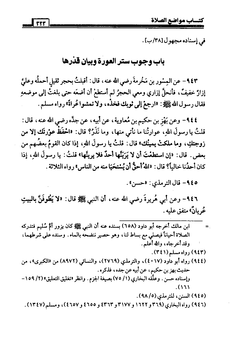 943 - عَن الْمسور بن مخرمَة رَضِيَ اللَّهُ عَنْه، قَالَ: أقبلتُ بِحجر ثقيل أحملهُ وعليّ إِزَار خَفِيف، فأنحلّ إزَارِي وَمَعِي الْحجر لم أستطع أَن أَضَعهُ حَتَّى بلغت إِلَى مَوْضِعه فَقَالَ رَسُول الله صَلَّى اللَّهُ عَلَيْهِ وَسَلَّم َ: " ارْجع إِلَى ثَوْبك فَخذه، وَلَا تَمْشُوا عُرَاة " رَوَاهُ مُسلم.