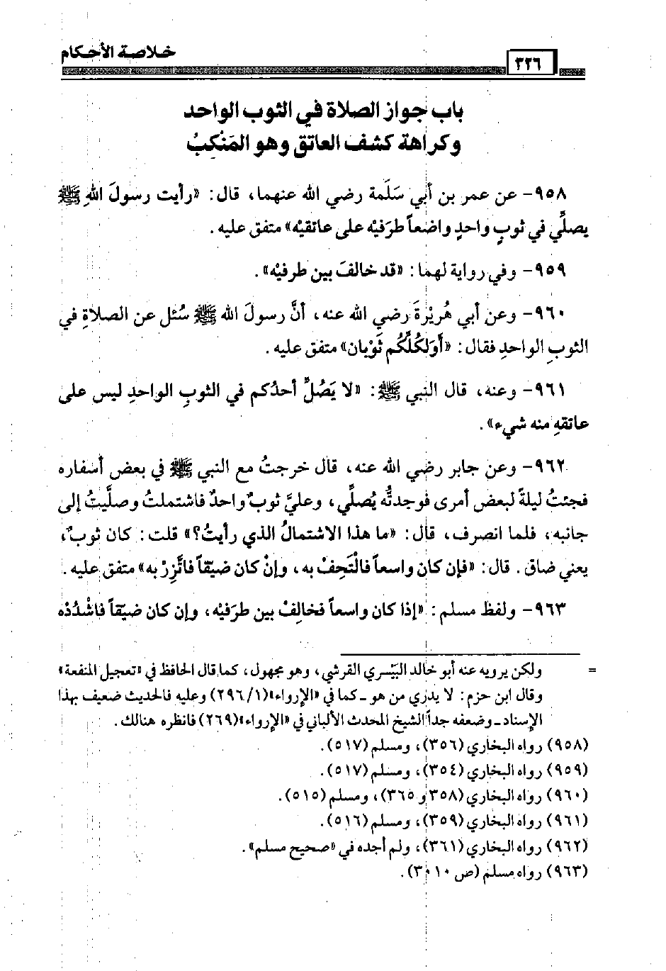 958 - عَن عمر بن أبي سَلمَة رَضِيَ اللَّهُ عَنْهما، قَالَ: " رَأَيْت رَسُول الله صَلَّى اللَّهُ عَلَيْهِ وَسَلَّم َ يُصَلِّي فِي ثوب وَاحِد وَاضِعا طَرفَيْهِ عَلَى عَاتِقيهِ " مُتَّفق عَلَيْهِ.