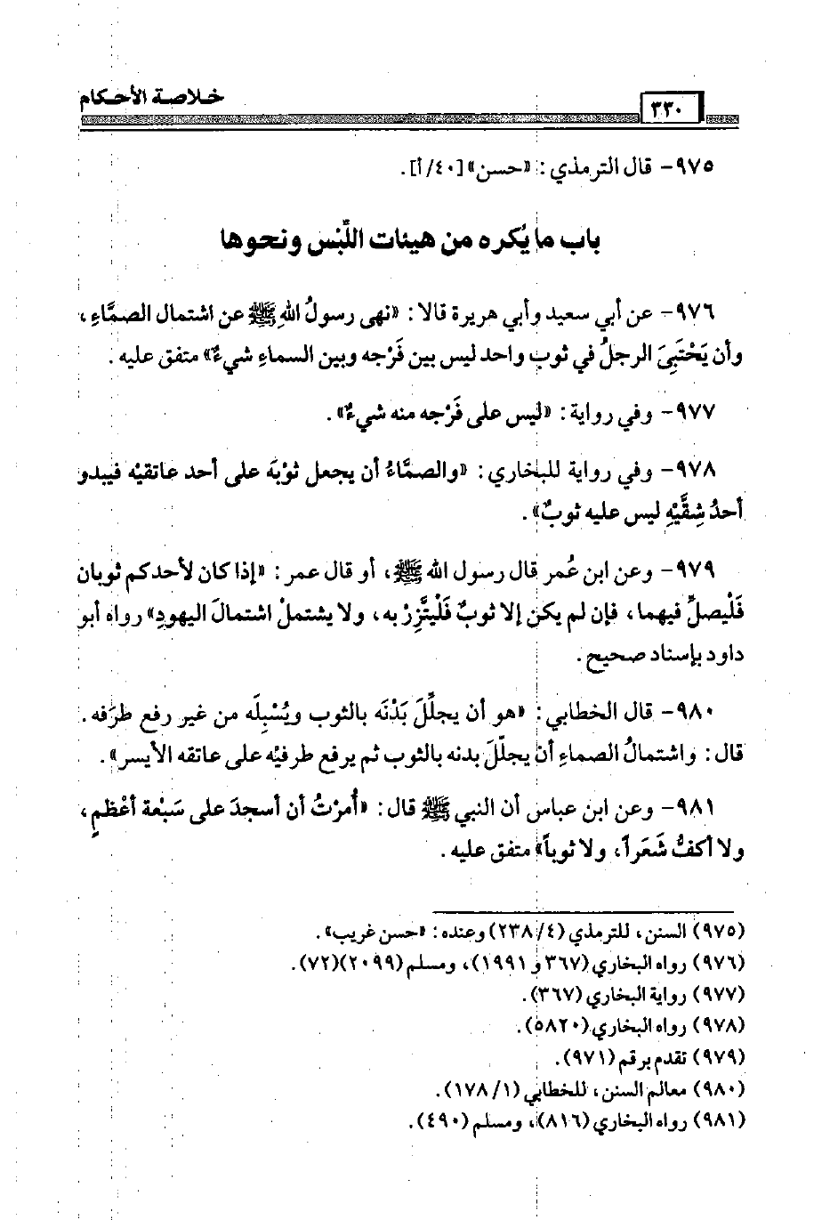 976 - عَن أبي سعيد وَأبي هُرَيْرَة قَالَا: " نهَى رَسُول الله صَلَّى اللَّهُ عَلَيْهِ وَسَلَّم َ عَن اشْتِمَال الصماء، وَأَن يحتبي الرجل فِي ثوب وَاحِد لَيْسَ بَين فرجه وَبَين السَّمَاء شَيْء " مُتَّفق عَلَيْهِ.