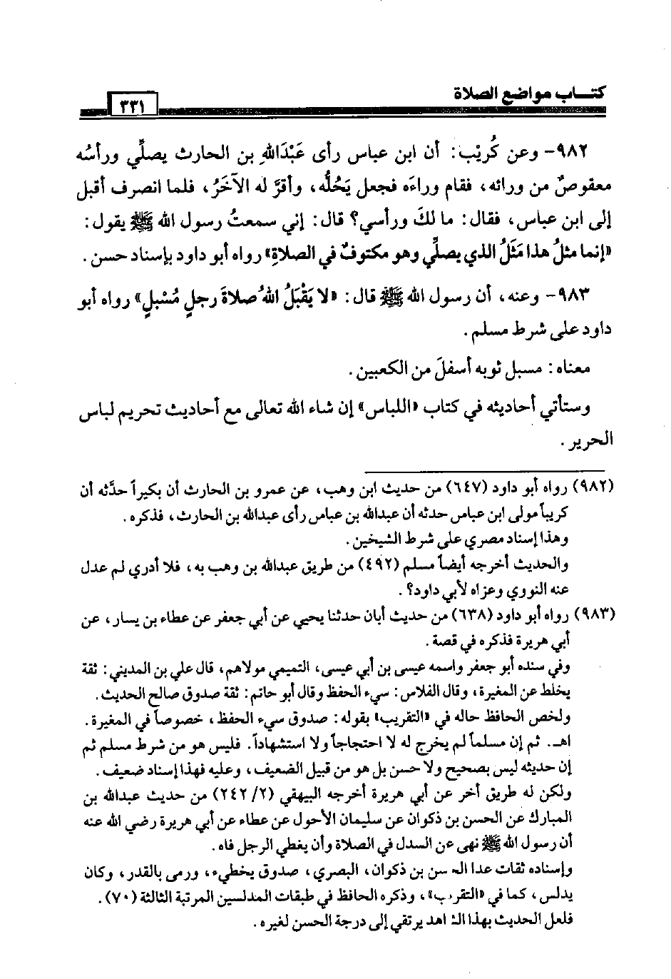 982 - وَعَن كريب: أَن ابْن عَبَّاس رَأَى عبد الله بن الْحَارِث يُصَلِّي وَرَأسه معقوص من وَرَائه، فَقَامَ وَرَاءه فَجعل يحله، وَأقر لَهُ الآخر، فَلَمَّا انْصَرف أقبل إِلَى ابْن عَبَّاس، فَقَالَ: مَا لَك ورأسي؟ قَالَ: إِنِّي سَمِعت رَسُول الله صَلَّى اللَّهُ عَلَيْهِ وَسَلَّم َ يَقُول: " إِنَّمَا مثل هَذَا مثل الَّذِي يُصَلِّي وَهُوَ مكتوف فِي الصَّلَاة " رَوَاهُ أَبُو دَاوُد بِإِسْنَاد حسن.