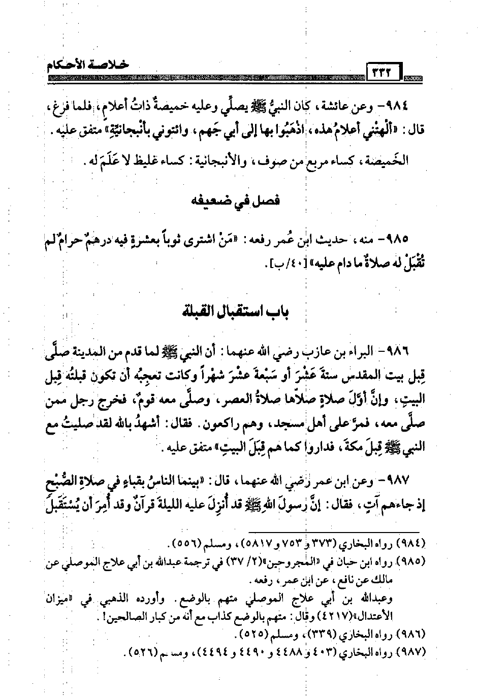 986 - الْبَراء بن عَازِب رَضِيَ اللَّهُ عَنْهما: أَن النَّبِي صَلَّى اللَّهُ عَلَيْهِ وَسَلَّم َ لما قدم من الْمَدِينَة صَلَّى قبل بَيت الْمُقَدّس سِتَّة عشر أَو سَبْعَة عشر شهرا وَكَانَت تعجبه أَن تكون قبلته قبل الْبَيْت، وَإِن أول صَلَاة صلاهَا صَلَاة الْعَصْر، وَصَلى مَعَه قوم، فَخرج رجل مِمَّن صَلَّى مَعَه، فَمر عَلَى أهل مَسْجِد، وهم رَاكِعُونَ. فَقَالَ: أشهد بِاللَّه لقد صليت مَعَ النَّبِي صَلَّى اللَّهُ عَلَيْهِ وَسَلَّم َ قبل مَكَّة، فَدَارُوا كَمَا هم قبل الْبَيْت " مُتَّفق عَلَيْهِ.