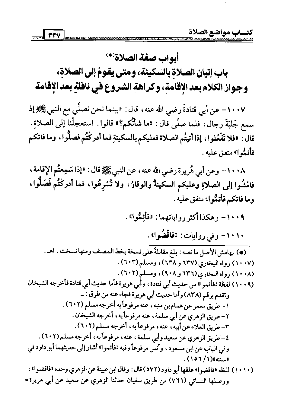 1008 - وَعَن أبي هُرَيْرَة رَضِيَ اللَّهُ عَنْه، عَن النَّبِي صَلَّى اللَّهُ عَلَيْهِ وَسَلَّم َ قَالَ: " إِذا سَمِعْتُمْ الْإِقَامَة، فامشوا إِلَى الصَّلَاة وَعَلَيْكُم السكينَة وَالْوَقار، وَلَا تسرعوا، فَمَا أدركتم فصلوا، وَمَا فاتكم فَأتمُّوا " مُتَّفق عَلَيْهِ.