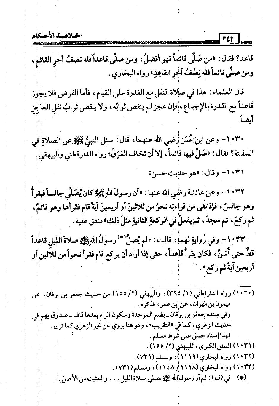 1030 - وَعَن ابْن عمر رَضِيَ اللَّهُ عَنْهما، قَالَ: سُئِلَ النَّبِي صَلَّى اللَّهُ عَلَيْهِ وَسَلَّم َ عَن الصَّلَاة فِي السَّفِينَة؟ فَقَالَ: " صل فِيهَا قَائِما، إِلَّا أَن تخَاف الْغَرق " رَوَاهُ الدَّارَقُطْنِيّ وَالْبَيْهَقِيّ.