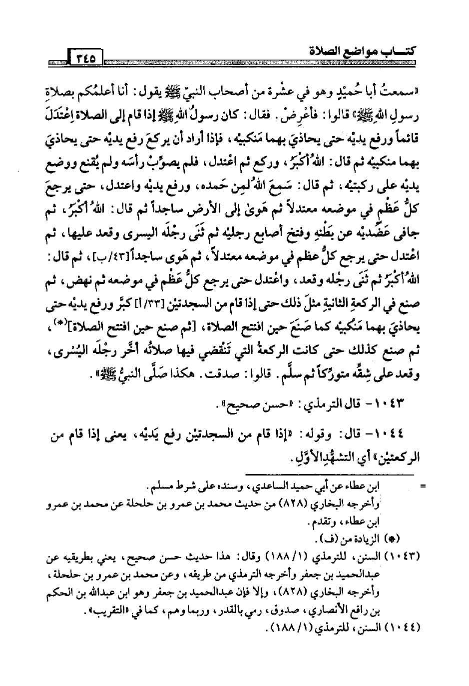 " سَمِعت أَبَا حميد وَهُوَ فِي عشرَة من أَصْحَاب النَّبِي صَلَّى اللَّهُ عَلَيْهِ وَسَلَّم َ يَقُول: أَنا أعلمكُم بِصَلَاة رَسُول الله صَلَّى اللَّهُ عَلَيْهِ وَسَلَّم َ " قَالُوا: فَأَعْرض. فَقَالَ: كَانَ رَسُول الله صَلَّى اللَّهُ عَلَيْهِ وَسَلَّم َ إِذا قَامَ إِلَى الصَّلَاة اعتدل قَائِما وَرفع يَدَيْهِ حَتَّى يُحَاذِي بهما مَنْكِبَيْه، فَإِذا أَرَادَ أَن يرْكَع رفع يَدَيْهِ حَتَّى يُحَاذِي بهما مَنْكِبَيْه ثمَّ قَالَ: الله أكبر، وَركع ثمَّ اعتدل، فَلم يصوب رَأسه وَلم يقنع وَوضع يَدَيْهِ عَلَى رُكْبَتَيْهِ، ثمَّ قَالَ: سمع الله لمن حَمده، وَرفع يَدَيْهِ واعتدل، حَتَّى يرجع كل عظم فِي مَوْضِعه معتدلا ثمَّ هوى إِلَى الأَرْض سَاجِدا ثمَّ قَالَ: الله أكبر، ثمَّ جافى عضديه عَن بَطْنه وفتخ أَصَابِع رجلَيْهِ ثمَّ ثنى رجله الْيُسْرَى وَقعد عَلَيْهَا، ثمَّ اعتدل حَتَّى يرجع كل عظم فِي مَوْضِعه معتدلا، ثمَّ هوى سَاجِدا [43 / ب] ، ثمَّ قَالَ: الله أكبر ثمَّ ثنى رجله وَقعد، واعتدل حَتَّى يرجع كل عظم فِي مَوْضِعه ثمَّ نَهَضَ، ثمَّ صنع فِي الرَّكْعَة الثَّانِيَة مثل ذَلِك حَتَّى إِذا قَامَ من السَّجْدَتَيْنِ [33 / أ] كبر وَرفع يَدَيْهِ حَتَّى يُحَاذِي بهما مَنْكِبَيْه كَمَا صنع حِين افْتتح الصَّلَاة، [ثمَّ صنع حِين افْتتح الصَّلَاة] ، ثمَّ صنع كَذَلِك حَتَّى كَانَت الرَّكْعَة الَّتِي تَنْقَضِي فِيهَا صلَاته أخر رجله الْيُسْرَى، وَقعد عَلَى شقَّه متوركا ثمَّ سلم. قَالُوا: صدقت. هَكَذَا صَلَّى النَّبِي صَلَّى اللَّهُ عَلَيْهِ وَسَلَّم َ ".