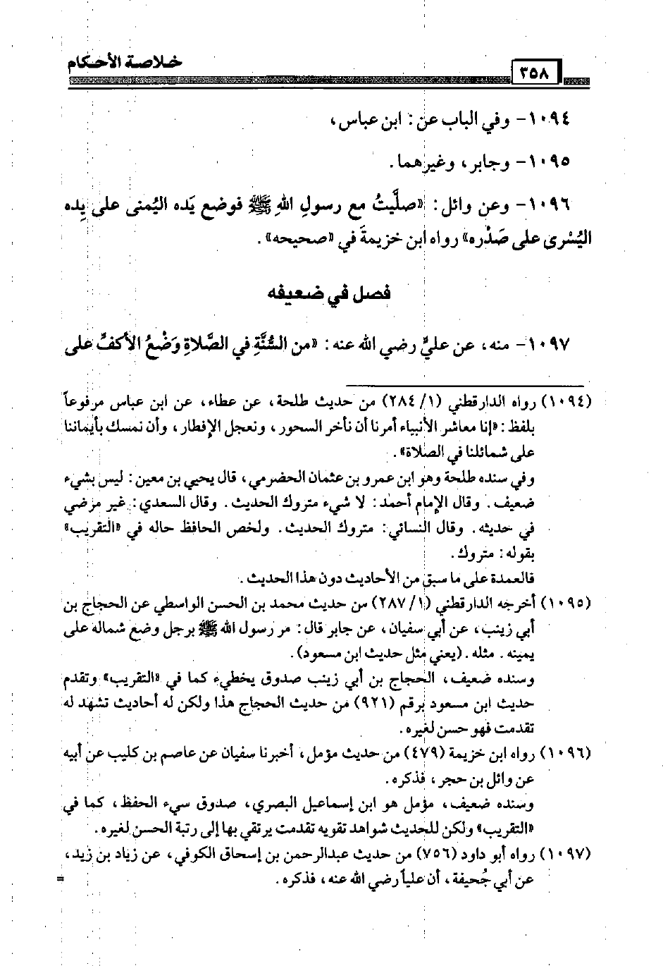 1096 - وَعَن وَائِل: " صليت مَعَ رَسُول الله صَلَّى اللَّهُ عَلَيْهِ وَسَلَّم َ فَوضع يَده الْيُمْنَى عَلَى يَده الْيُسْرَى عَلَى صَدره " رَوَاهُ ابْن خُزَيْمَة فِي " صَحِيحه ".