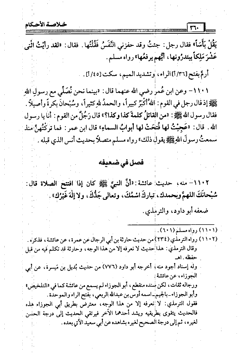 1102 - مِنْهُ، حَدِيث عَائِشَة: " أَن النَّبِي صَلَّى اللَّهُ عَلَيْهِ وَسَلَّم َ كَانَ إِذا افْتتح الصَّلَاة قَالَ: سُبْحَانَكَ اللَّهُمَّ وَبِحَمْدِك، تبَارك اسْمك، وَتَعَالَى جدك، وَلَا إِلَه غَيْرك ". ضعفه أَبُو دَاوُد، وَالتِّرْمِذِيّ.