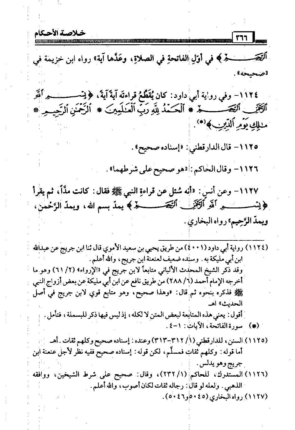 الرَّحِيم) فِي أول الْفَاتِحَة فِي الصَّلَاة، وعدها آيَة " رَوَاهُ ابْن خُزَيْمَة فِي " صَحِيحه ".