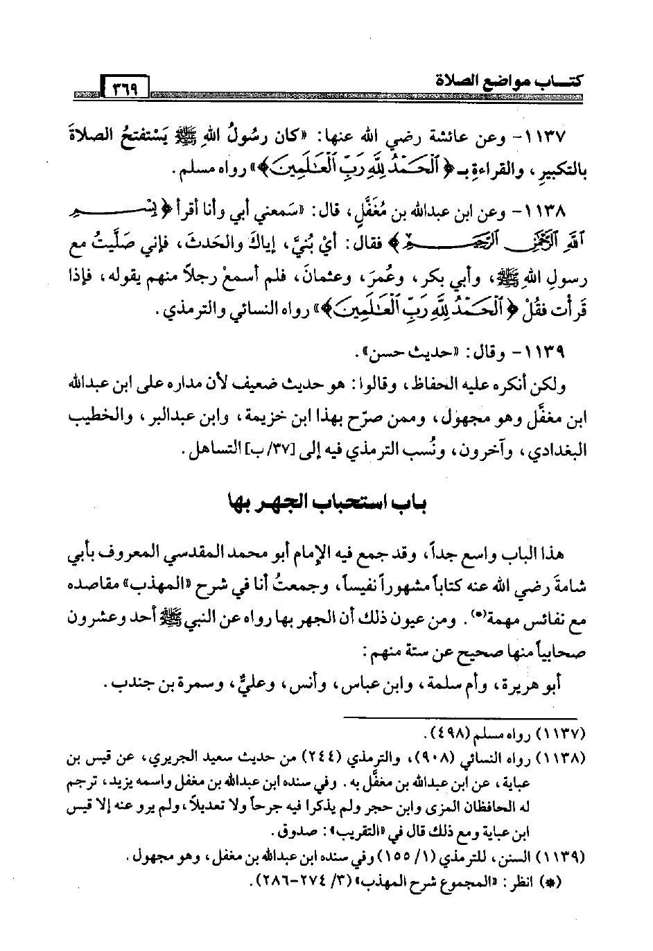 هَذَا الْبَاب وَاسع جدا، وَقد جمع فِيهِ الإِمَام أَبُو مُحَمَّد الْمَقْدِسِي الْمَعْرُوف بِأبي شامة رَضِيَ اللَّهُ عَنْه كتابا مَشْهُورا نفيسا، وجمعت أَنا فِي شرح " الْمُهَذّب " مقاصده مَعَ نفائس مهمة. وَمن عُيُون ذَلِك أَن الْجَهْر بهَا رَوَاهُ عَن النَّبِي صَلَّى اللَّهُ عَلَيْهِ وَسَلَّم َ أحد وَعِشْرُونَ صحابيا مِنْهَا صَحِيح عَن سِتَّة مِنْهُم: أَبُو هُرَيْرَة، وَأم سَلمَة، وَابْن عَبَّاس، وَأنس، وَعلي، وَسمرَة بن جُنْدُب.