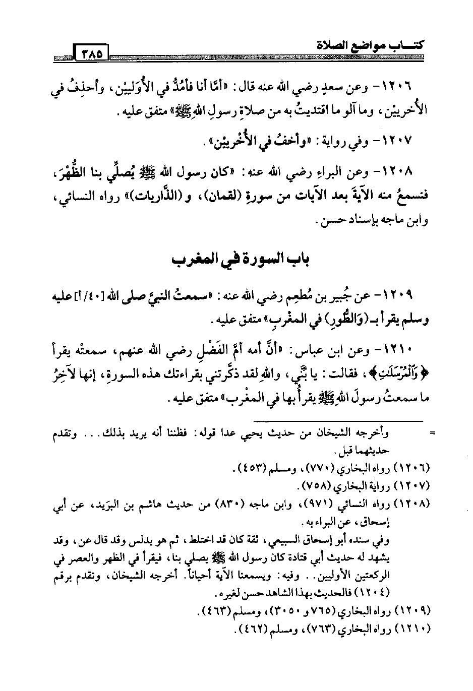 1209 - عَن جُبَير بن مطعم رَضِيَ اللَّهُ عَنْه: " سَمِعت النَّبِي صَلَّى اللَّهُ عَلَيْهِ وَسَلَّم َ [40 / أ] يقْرَأ ب (وَالطور) فِي الْمغرب " مُتَّفق عَلَيْهِ.