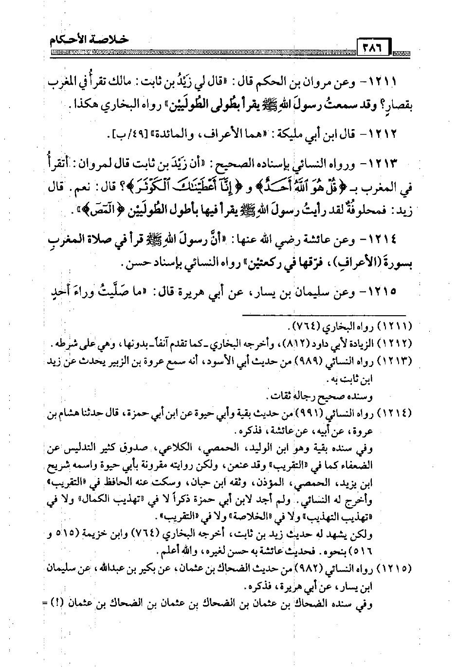 1213 - وَرَوَاهُ النَّسَائِيّ بِإِسْنَادِهِ الصَّحِيح: " أَن زيد بن ثَابت قَالَ لمروان: أَتَقْرَأُ فِي الْمغرب ب {قل هُوَ الله أحد} و {إِنَّا أعطيناك الْكَوْثَر} قَالَ: نعم. قَالَ زيد: فمحلوفة لقد رَأَيْت رَسُول الله صَلَّى اللَّهُ عَلَيْهِ وَسَلَّم َ يقْرَأ فِيهَا بأطول الطوليين {المص} ".