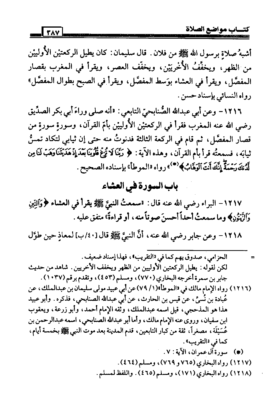 1216 - وَعَن أبي عبد الله الصنَابحِي التَّابِعِيّ: " أَنه صَلَّى وَرَاء أبي بكر الصّديق رَضِيَ اللَّهُ عَنْه الْمغرب فَقَرَأَ فِي الرَّكْعَتَيْنِ الْأَوليين بِأم الْقُرْآن، وَسورَة سُورَة من قصار الْمفصل، ثمَّ قَامَ فِي الرَّكْعَة الثَّالِثَة فدنوت مِنْهُ حَتَّى إِن ثِيَابِي لتكاد تمس ثِيَابه، فَسَمعته قَرَأَ بِأم الْقُرْآن، وَهَذِه الْآيَة: {رَبنَا لَا تزغ قُلُوبنَا بعد إِذْ هديتنا وهب لنا من لَدُنْك رَحْمَة إِنَّك أَنْت الْوَهَّاب} " رَوَاهُ " الْمُوَطَّأ " بِإِسْنَادِهِ الصَّحِيح.