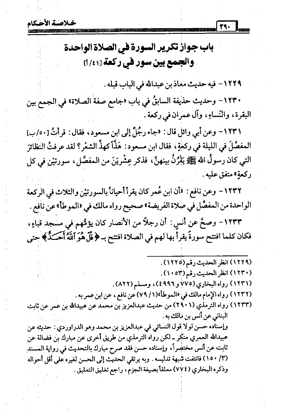 1230 - وَحَدِيث حُذَيْفَة السَّابِق فِي بَاب " جَامع صفة الصَّلَاة " فِي الْجمع بَين الْبَقَرَة، وَالنِّسَاء، وَآل عمرَان فِي رَكْعَة.