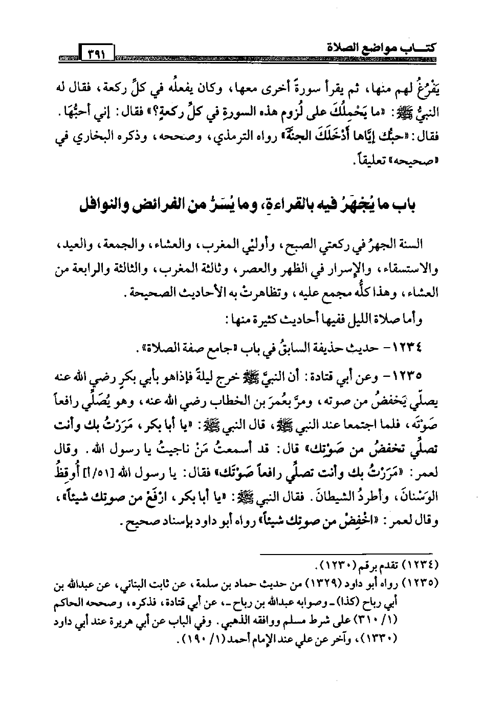 1235 - وَعَن أبي قَتَادَة: أَن النَّبِي صَلَّى اللَّهُ عَلَيْهِ وَسَلَّم َ خرج لَيْلَة فَإِذا هُوَ بِأبي بكر رَضِيَ اللَّهُ عَنْه يُصَلِّي يخْفض من صَوته، وَمر بعمر بن الْخطاب رَضِيَ اللَّهُ عَنْه، وَهُوَ يُصَلِّي رَافعا صَوته، فَلَمَّا اجْتمعَا عِنْد النَّبِي صَلَّى اللَّهُ عَلَيْهِ وَسَلَّم َ، قَالَ النَّبِي صَلَّى اللَّهُ عَلَيْهِ وَسَلَّم َ: " يَا أَبَا بكر، مَرَرْت بك وَأَنت تصلي تخْفض من صَوْتك " قَالَ: قد أسمعت من نَاجَيْت يَا رَسُول الله. وَقَالَ لعمر: " مَرَرْت بك وَأَنت تصلي رَافعا صَوْتك " فَقَالَ: يَا رَسُول الله [51 / أ] أُوقِظ الْوَسْنَان، وَأطْرد الشَّيْطَان. فَقَالَ النَّبِي صَلَّى اللَّهُ عَلَيْهِ وَسَلَّم َ: " يَا أَبَا بكر، ارْفَعْ من صَوْتك شَيْئا "، وَقَالَ لعمر: " اخْفِضْ من صَوْتك شَيْئا " رَوَاهُ أَبُو دَاوُد بِإِسْنَاد صَحِيح.