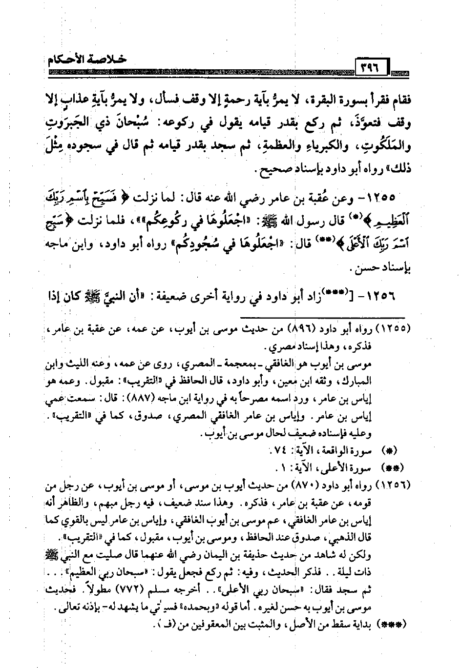 1255 - وَعَن عقبَة بن عَامر رَضِيَ اللَّهُ عَنْه قَالَ: لما نزلت {فسبح باسم رَبك الْعَظِيم} قَالَ رَسُول الله صَلَّى اللَّهُ عَلَيْهِ وَسَلَّم َ " اجْعَلُوهَا فِي ركوعكم "، فَلَمَّا نزلت {سبح اسْم رَبك الْأَعْلَى} قَالَ: " اجْعَلُوهَا فِي سُجُودكُمْ " رَوَاهُ أَبُو دَاوُد، وَابْن ماجة بِإِسْنَاد حسن.