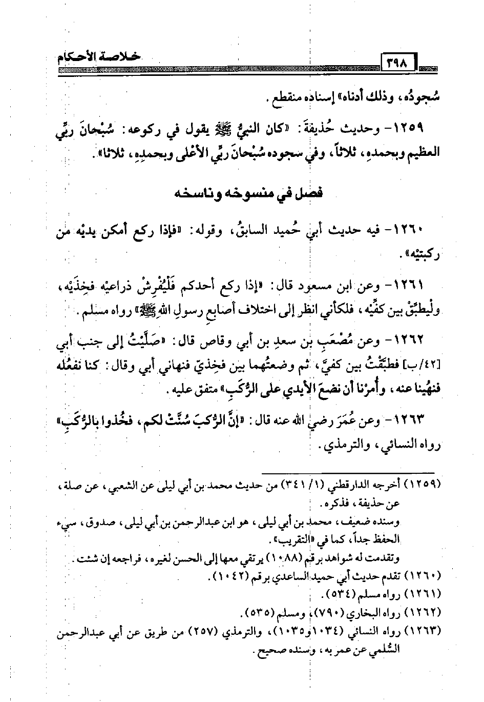 1262 - وَعَن مُصعب بن سعد بن أبي وَقاص قَالَ: " صليت إِلَى جنب أبي [42 / ب] فطبقت بَين كفي، ثمَّ وضعتهما بَين فَخذي فنهاني أبي وَقَالَ: كُنَّا نفعله فنهينا عَنهُ، وأمرنا أَن نضع الْأَيْدِي عَلَى الركب " مُتَّفق عَلَيْهِ.
