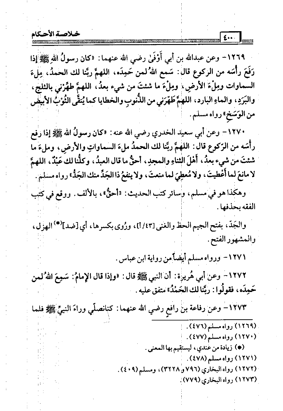 1270 - وَعَن أبي سعيد الْخُدْرِيّ رَضِيَ اللَّهُ عَنْه: " كَانَ رَسُول الله صَلَّى اللَّهُ عَلَيْهِ وَسَلَّم َ إِذا رفع رَأسه من الرُّكُوع قَالَ: اللَّهُمَّ رَبنَا لَك الْحَمد ملْء السَّمَاوَات وَالْأَرْض، وملء مَا شِئْت من شَيْء بعد، أهل الثَّنَاء وَالْمجد، أَحَق مَا قَالَ العَبْد، وكلنَا لَك عبد، اللَّهُمَّ لَا مَانع لما أَعْطَيْت، وَلَا معطي لما منعت، وَلَا ينفع ذَا الْجد مِنْك الْجد " رَوَاهُ مُسلم. وَهَكَذَا هُوَ فِي مُسلم، وَسَائِر كتب الحَدِيث: " أَحَق " بِالْألف. وَوَقع فِي كتب الْفِقْه بحذفها. وَالْجد، بِفَتْح الْجِيم الْحَظ والغنى [43 / أ] ، وَرُوِيَ بِكَسْرِهَا، أَي [ضد] الْهزْل، وَالْمَشْهُور الْفَتْح.