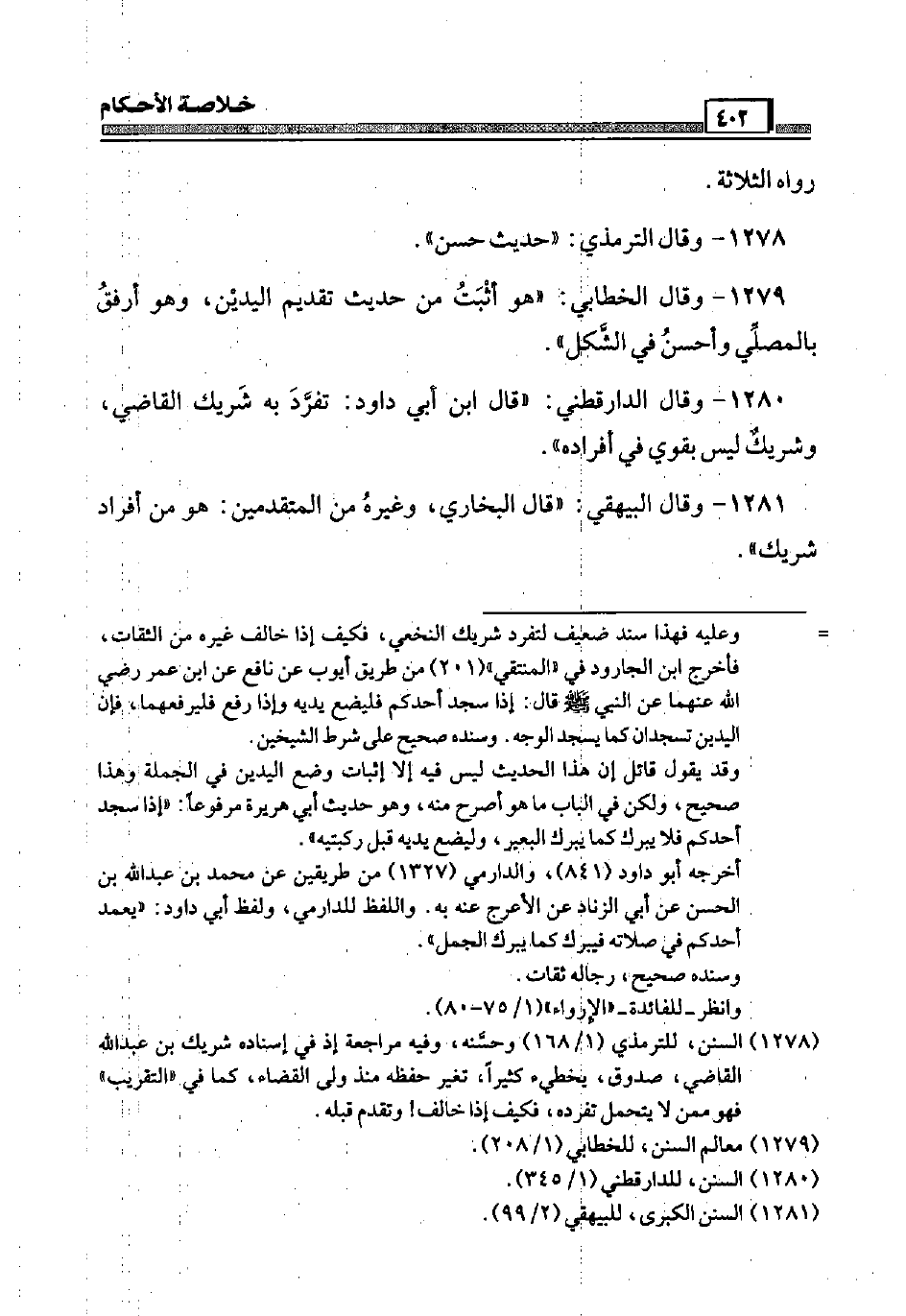 1279 - وَقَالَ الْخطابِيّ: " هُوَ أثبت من حَدِيث تَقْدِيم الْيَدَيْنِ، وَهُوَ أرْفق بالمصلي وَأحسن فِي الشكل ".