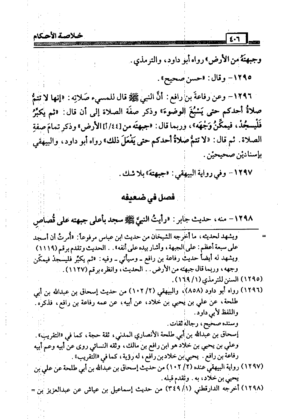 1296 - وَعَن رِفَاعَة بن رَافع: أَن النَّبِي صَلَّى اللَّهُ عَلَيْهِ وَسَلَّم َ قَالَ للمسيء صلَاته: " إِنَّهَا لَا تتمّ صَلَاة أحدكُم حَتَّى يسبغ الْوضُوء " وَذكر صفة الصَّلَاة إِلَى أَن قَالَ: " ثمَّ يكبِّر فليسجد، فَيمكن وَجهه "، وَرُبمَا قَالَ: " جَبهته من [44 / أ] الأَرْض " وَذكر تَمام صفة الصَّلَاة. ثمَّ قَالَ: " لَا تتمّ صَلَاة أحدكُم حَتَّى يفعل ذَلِك " رَوَاهُ أَبُو دَاوُد، وَالْبَيْهَقِيّ بِإِسْنَادَيْنِ صَحِيحَيْنِ.