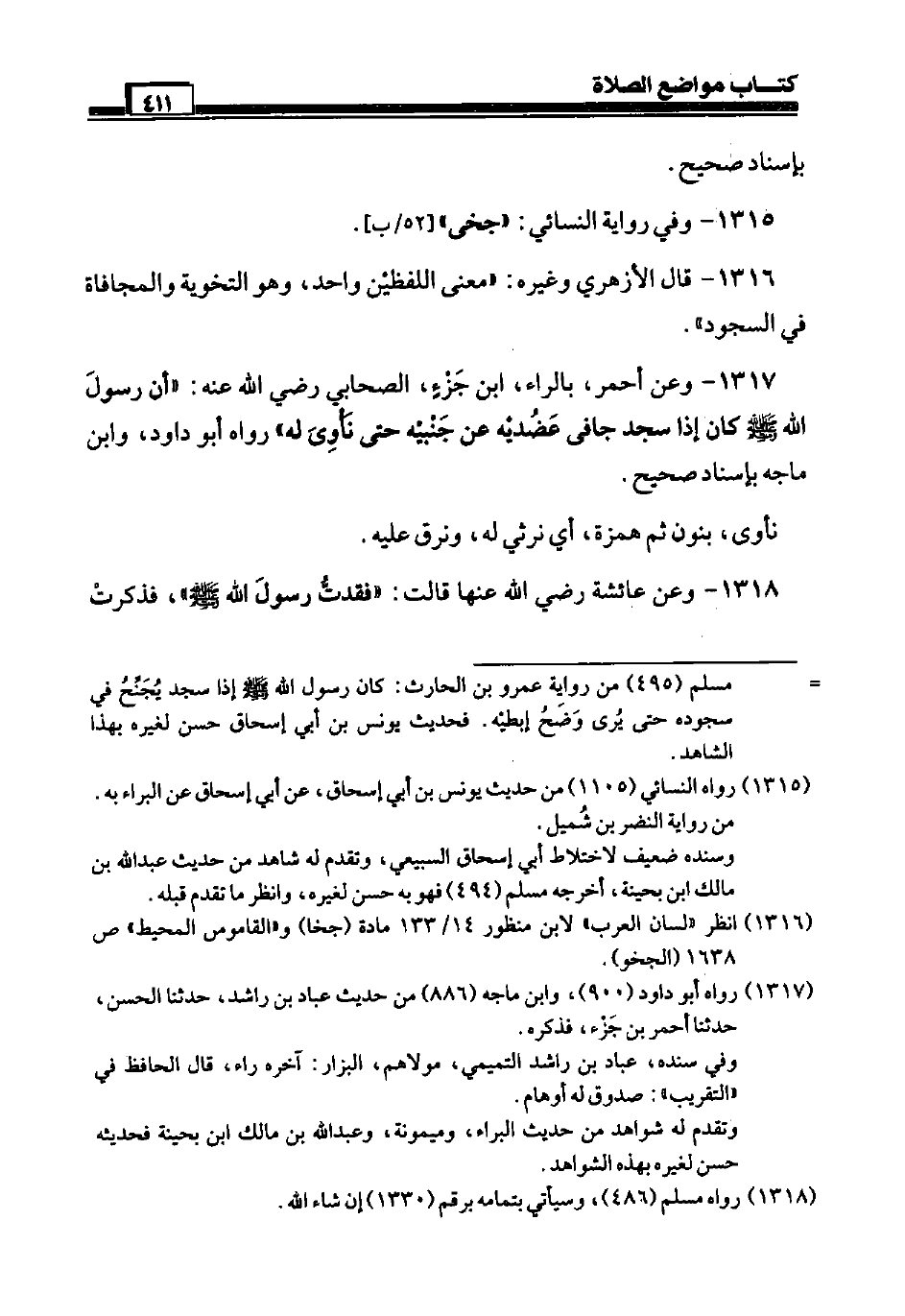 1316 - قَالَ الْأَزْهَرِي وَغَيره: " مَعْنَى اللَّفْظَيْنِ وَاحِد، وَهُوَ التخوية والمجافاة فِي السُّجُود ".