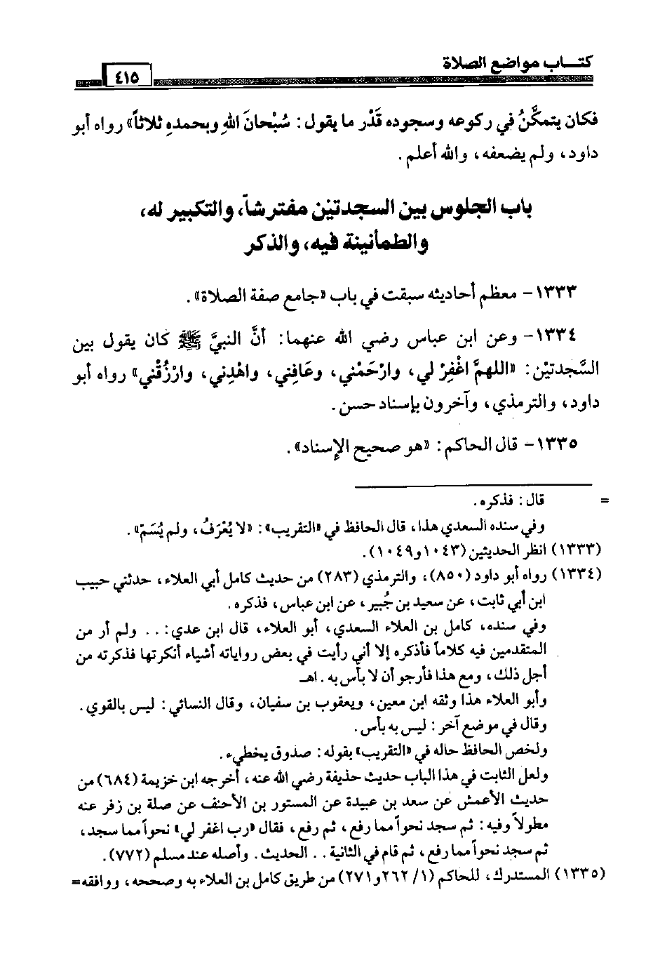 1334 - وَعَن ابْن عَبَّاس رَضِيَ اللَّهُ عَنْهما: أَن النَّبِي صَلَّى اللَّهُ عَلَيْهِ وَسَلَّم َ كَانَ يَقُول بَين السَّجْدَتَيْنِ: " اللَّهُمَّ اغْفِر لي، وارحمني، وَعَافنِي، واهدني، وارزقني " رَوَاهُ أَبُو دَاوُد، وَالتِّرْمِذِيّ، وَآخَرُونَ بِإِسْنَاد حسن.