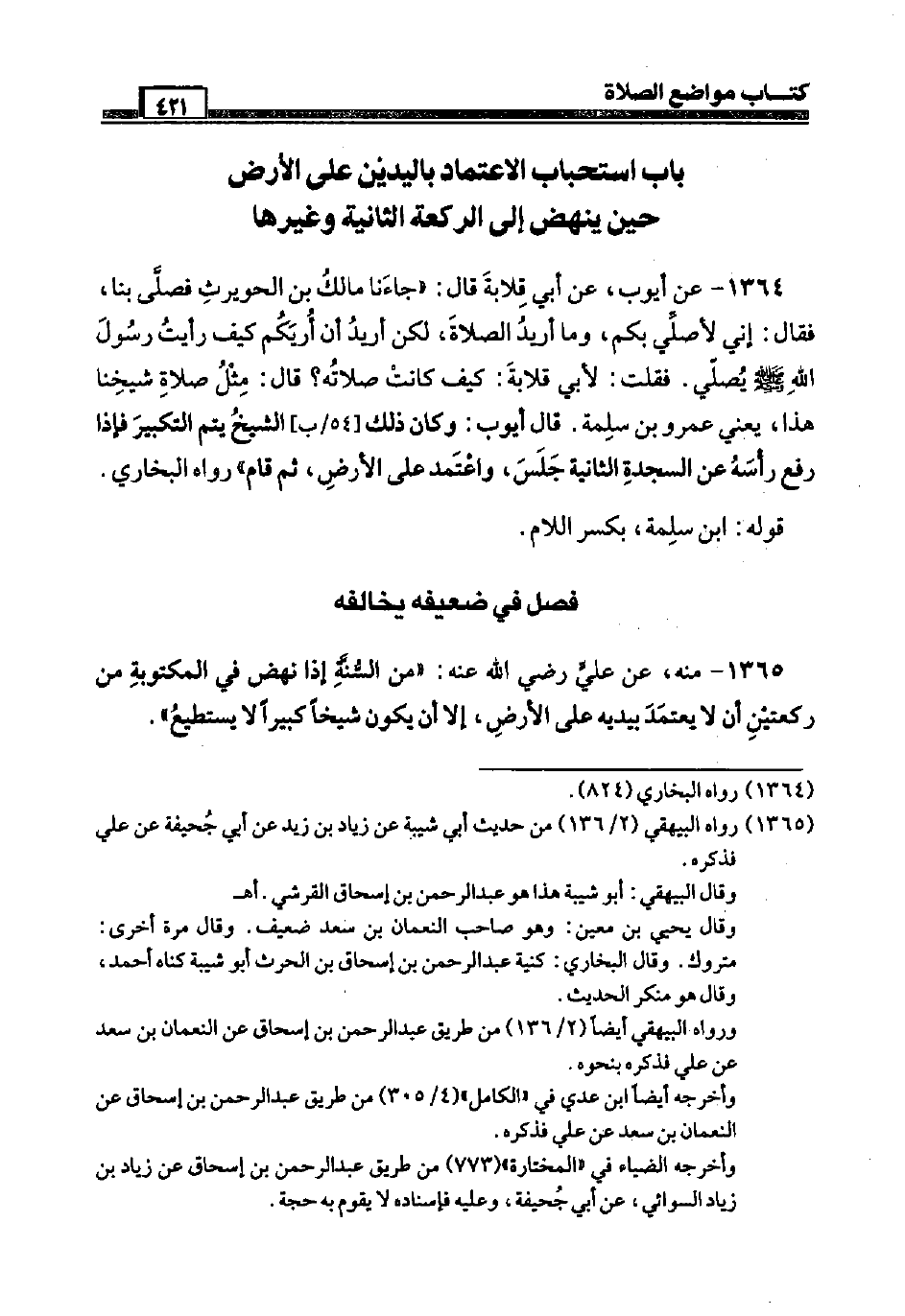 1364 - عَن أَيُّوب، عَن أبي قلَابَة قَالَ: " جَاءَنَا مَالك بن الْحُوَيْرِث فَصَلى بِنَا، فَقَالَ: إِنِّي لأصلي بكم، وَمَا أُرِيد الصَّلَاة، لَكِن أُرِيد أَن أريكم كَيفَ رَأَيْت رَسُول الله صَلَّى اللَّهُ عَلَيْهِ وَسَلَّم َ يُصَلِّي. فَقلت: لأبي قلَابَة: كَيفَ كَانَت صلَاته؟ قَالَ: مثل صَلَاة شَيخنَا هَذَا، يَعْنِي عَمْرو بن سَلمَة. قَالَ أَيُّوب: وَكَانَ ذَلِك [54 / ب] الشَّيْخ يتم التَّكْبِير فَإِذا رفع رَأسه عَن السَّجْدَة الثَّانِيَة جلس، وَاعْتمد عَلَى الأَرْض، ثمَّ قَامَ " رَوَاهُ البُخَارِيّ. قَوْله: ابْن سَلمَة، بِكَسْر اللَّام.