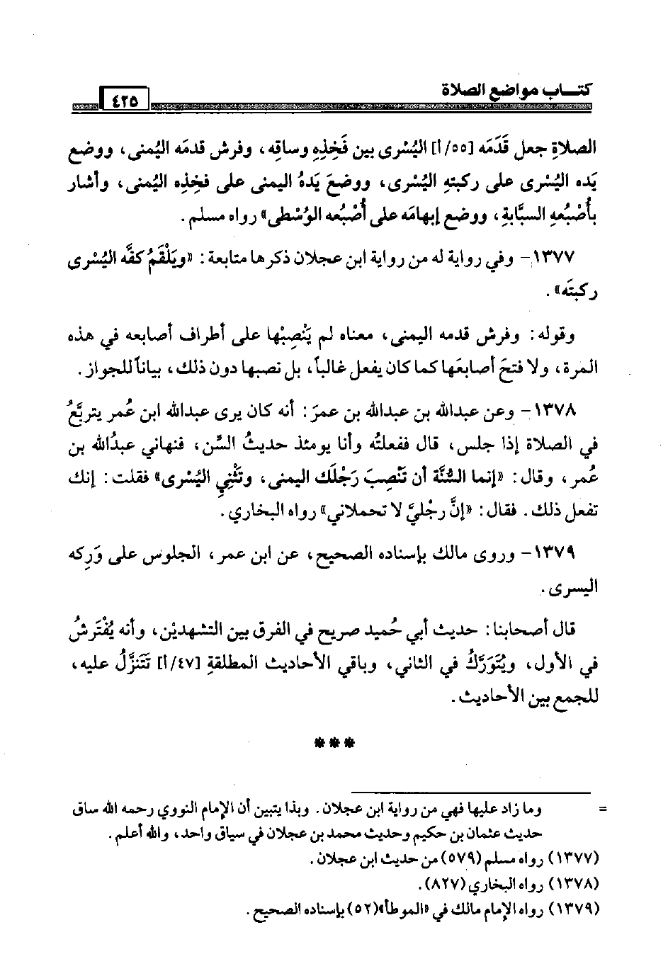1379 - وَرَوَى مَالك بِإِسْنَادِهِ الصَّحِيح، عَن ابْن عمر، الْجُلُوس عَلَى وركه الْيُسْرَى. قَالَ أَصْحَابنَا: حَدِيث أبي حميد صَرِيح فِي الْفرق بَين التشهدين، وَأَنه يفترش فِي الأول، ويتورك فِي الثَّانِي، وَبَاقِي الْأَحَادِيث الْمُطلقَة [47 / أ] تتنزل عَلَيْهِ، للْجمع بَين الْأَحَادِيث.