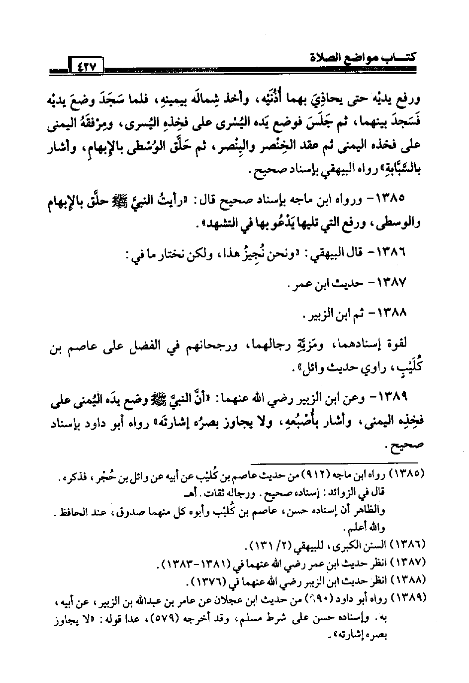 1388 - ثمَّ ابْن الزبير. لقُوَّة إسنادهما، ومزية رجالهما، ورجحانهم فِي الْفضل عَلَى عَاصِم بن كُلَيْب، رَاوِي حَدِيث وَائِل ".