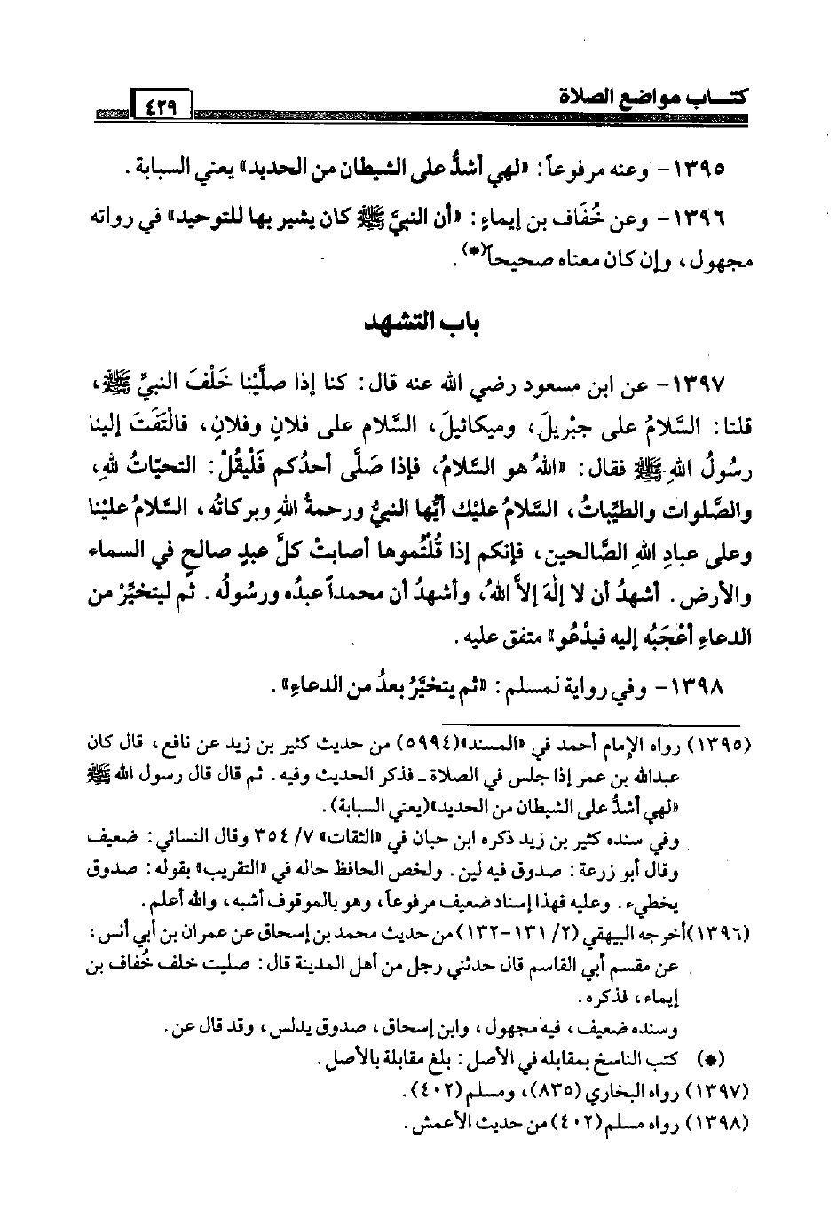 1397 - عَن ابْن مَسْعُود رَضِيَ اللَّهُ عَنْه قَالَ: كُنَّا إِذا صلينَا خلف النَّبِي صَلَّى اللَّهُ عَلَيْهِ وَسَلَّم َ، قُلْنَا: السَّلَام عَلَى جِبْرِيل، وَمِيكَائِيل، السَّلَام عَلَى فلَان وَفُلَان، فَالْتَفت إِلَيْنَا رَسُول الله صَلَّى اللَّهُ عَلَيْهِ وَسَلَّم َ فَقَالَ: " الله هُوَ السَّلَام، فَإِذا صَلَّى أحدكُم فَلْيقل: التَّحِيَّات لله، والصلوات والطيبات، السَّلَام عَلَيْك أَيهَا النَّبِي وَرَحْمَة الله وَبَرَكَاته، السَّلَام علينا وَعَلَى عباد الله الصَّالِحين، فَإِنَّكُم إِذا قُلْتُمُوهَا أَصَابَت كل عبد صَالح فِي السَّمَاء وَالْأَرْض. أشهد أَن لَا إِلَه إِلَّا الله، وَأشْهد أَن مُحَمَّدًا عَبده وَرَسُوله. ثمَّ ليتخير من الدُّعَاء أعجبه إِلَيْهِ فيدعو " مُتَّفق عَلَيْهِ.