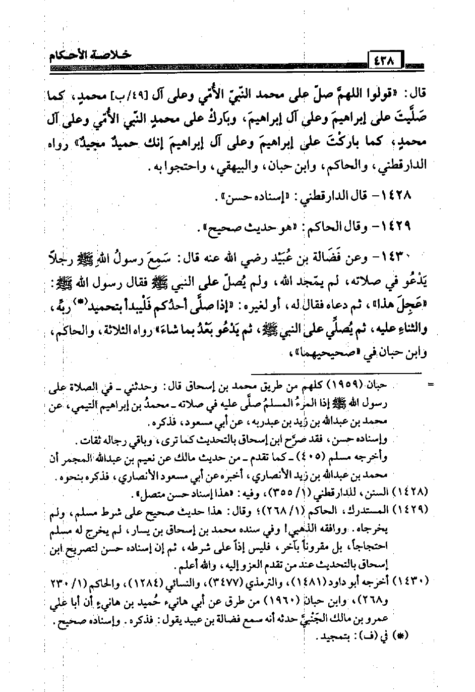 1430 - وَعَن فضَالة بن عبيد رَضِيَ اللَّهُ عَنْه قَالَ: سمع رَسُول الله صَلَّى اللَّهُ عَلَيْهِ وَسَلَّم َ رجلا يَدْعُو فِي صلَاته، لم يمجد الله، وَلم يصل عَلَى النَّبِي صَلَّى اللَّهُ عَلَيْهِ وَسَلَّم َ فَقَالَ رَسُول الله صَلَّى اللَّهُ عَلَيْهِ وَسَلَّم َ: " عجِل هَذَا "، ثمَّ دَعَاهُ فَقَالَ لَهُ، أَو لغيره: " إِذا صَلَّى أحدكُم فليبدأ بتحميد ربه وَالثنَاء عَلَيْهِ، ثمَّ يُصَلِّي عَلَى النَّبِي صَلَّى اللَّهُ عَلَيْهِ وَسَلَّم َ، ثمَّ يَدْعُو بعد بِمَا شَاءَ " رَوَاهُ الثَّلَاثَة، وَالْحَاكِم، وَابْن حبَان فِي " صَحِيحَيْهِمَا "،