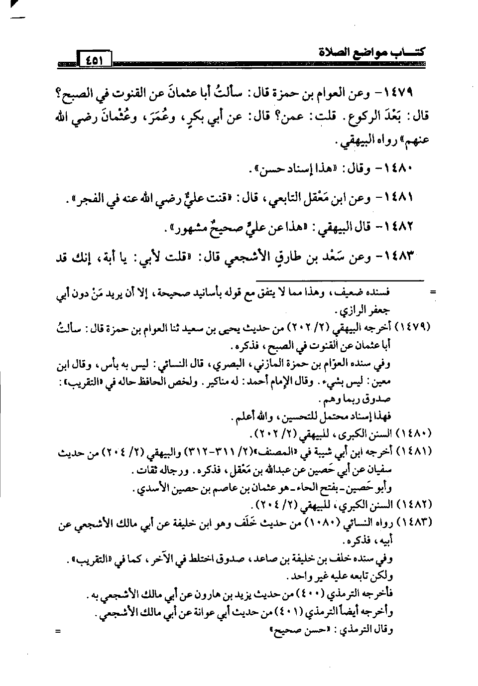 1479 - وَعَن الْعَوام بن حَمْزَة قَالَ: سَأَلت أَبَا عُثْمَان عَن الْقُنُوت فِي الصُّبْح؟ قَالَ: بعد الرُّكُوع. قلت: عَمَّن؟ قَالَ: عَن أبي بكر، وَعمر، وَعُثْمَان رَضِيَ اللَّهُ عَنْهم " رَوَاهُ الْبَيْهَقِيّ.
