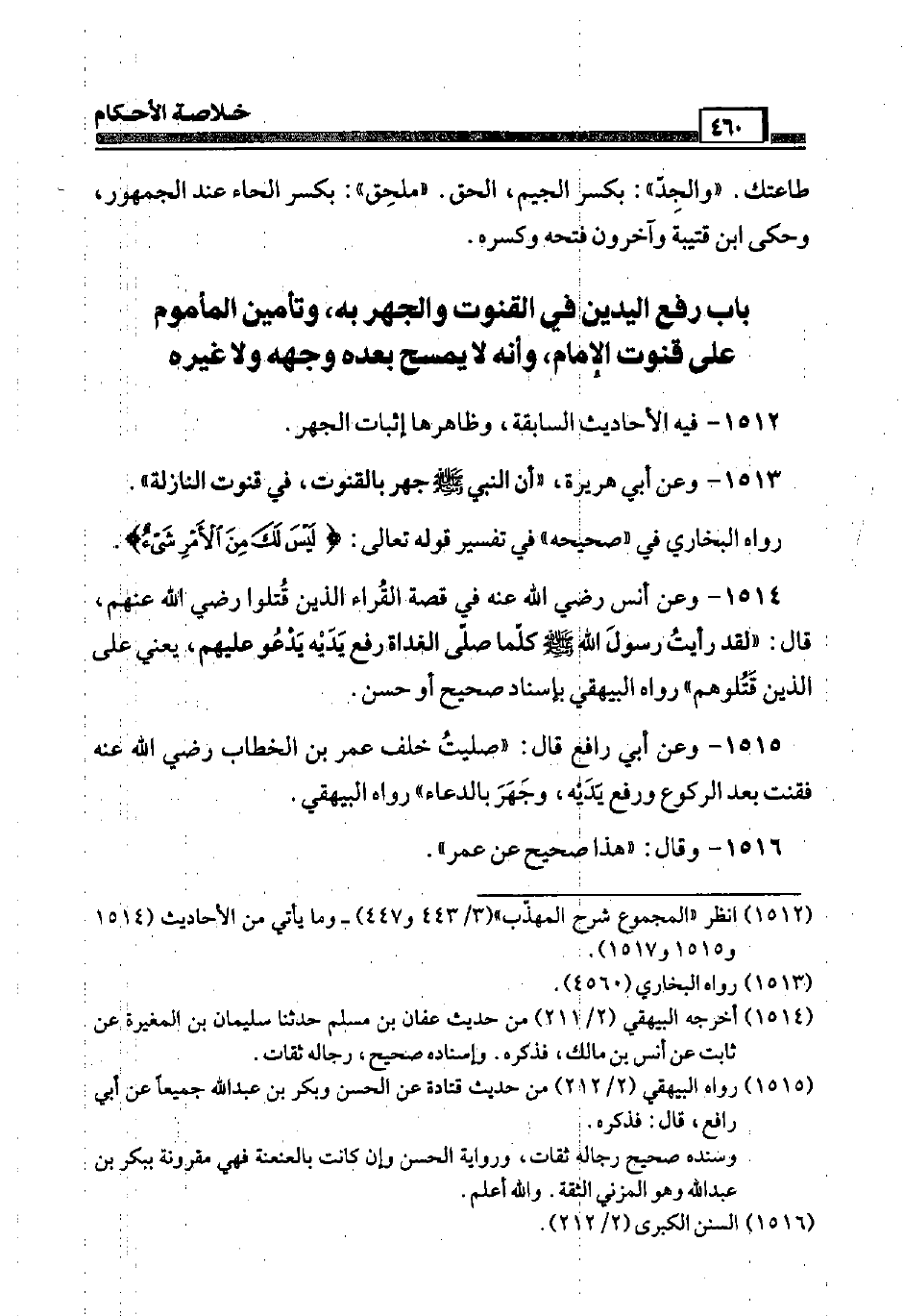 1515 - وَعَن أبي رَافع قَالَ: " صليت خلف عمر بن الْخطاب رَضِيَ اللَّهُ عَنْه فقنت بعد الرُّكُوع وَرفع يَدَيْهِ، وجهر بِالدُّعَاءِ " رَوَاهُ الْبَيْهَقِيّ.