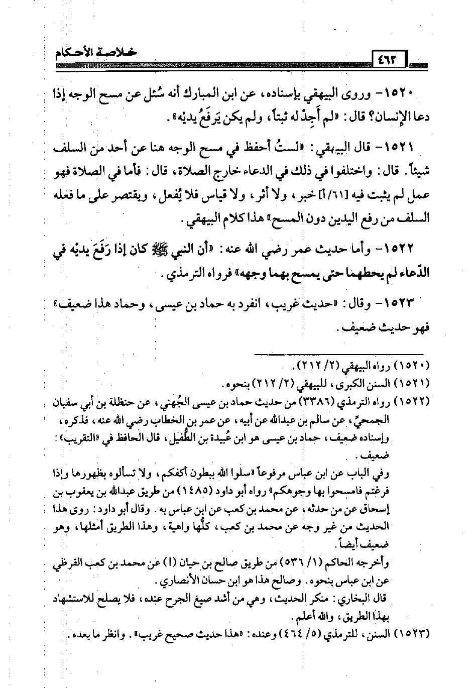 1522 - وَأما حَدِيث عمر رَضِيَ اللَّهُ عَنْه: " أَن النَّبِي صَلَّى اللَّهُ عَلَيْهِ وَسَلَّم َ كَانَ إِذا رفع يَدَيْهِ فِي الدُّعَاء لم يحطهما حَتَّى يمسح بهما وَجهه " فَرَوَاهُ التِّرْمِذِيّ.