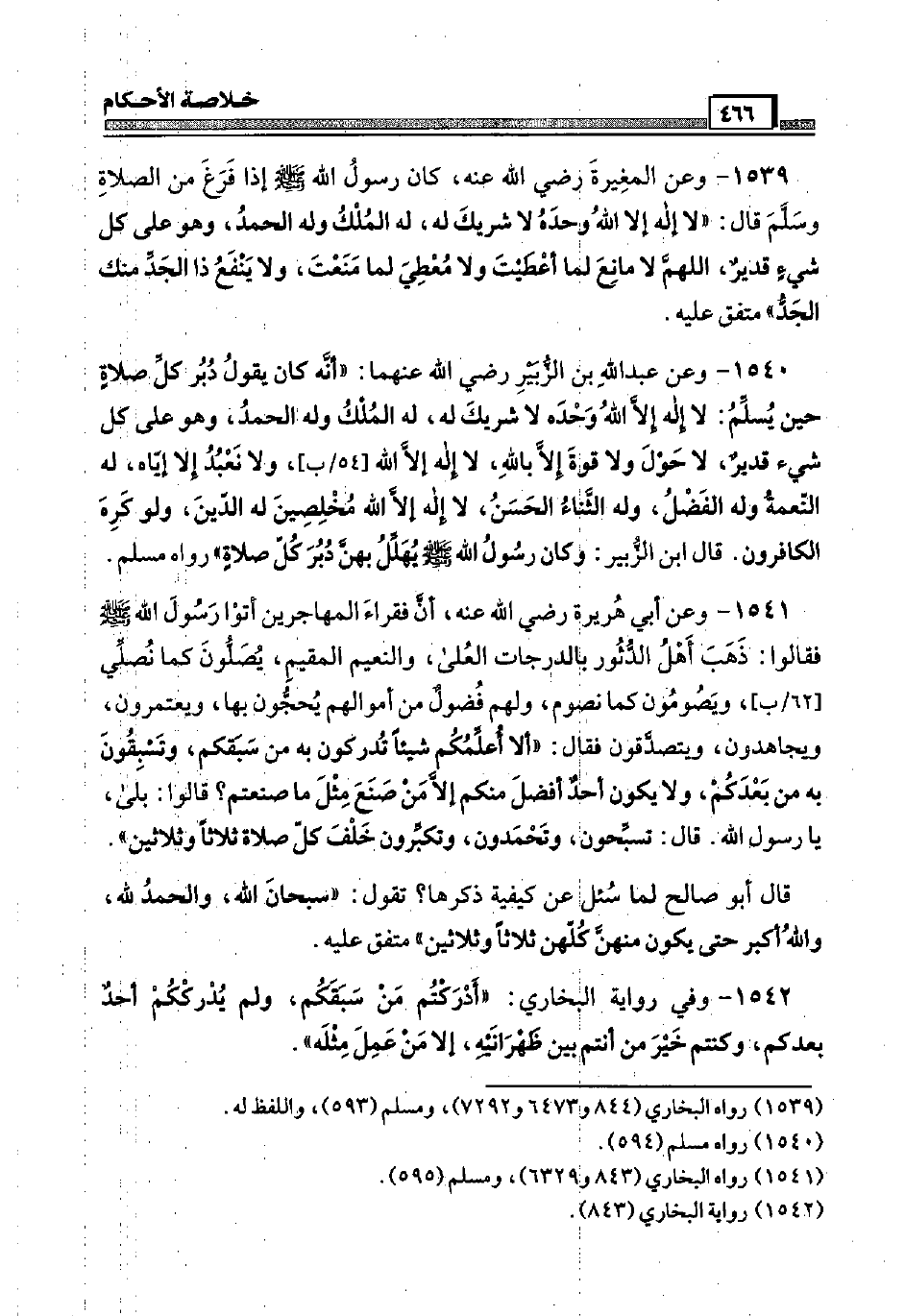 1541 - وَعَن أبي هُرَيْرَة رَضِيَ اللَّهُ عَنْه، أَن فُقَرَاء الْمُهَاجِرين أَتَوا رَسُول الله صَلَّى اللَّهُ عَلَيْهِ وَسَلَّم َ فَقَالُوا: ذهب أهل الدُّثُور بالدرجات العلى، وَالنَّعِيم الْمُقِيم، يصلونَ كَمَا نصلي [62 / ب] ، وَيَصُومُونَ كَمَا نَصُوم، وَلَهُم فضول من أَمْوَالهم يحجون بهَا، ويعتمرون، ويجاهدون، وَيَتَصَدَّقُونَ فَقَالَ: " أَلا أعلمكُم شَيْئا تدركون بِهِ من سبقكم، وتسبقون بِهِ من بعدكم، وَلَا يكون أحد أفضل مِنْكُم إِلَّا من صنع مثل مَا صَنَعْتُم؟ قَالُوا: بلَى يَا رَسُول الله. قَالَ: تسبحون، وتحمدون، وتكبرون خلف كل صَلَاة ثَلَاثًا وَثَلَاثِينَ ". قَالَ أَبُو صَالح لما سُئل عَن كَيْفيَّة ذكرهَا؟ تَقول: " سُبْحَانَ الله، وَالْحَمْد لله، وَالله أكبر حَتَّى يكون مِنْهُنَّ كُلهنَّ ثَلَاثًا وَثَلَاثِينَ " مُتَّفق عَلَيْهِ.