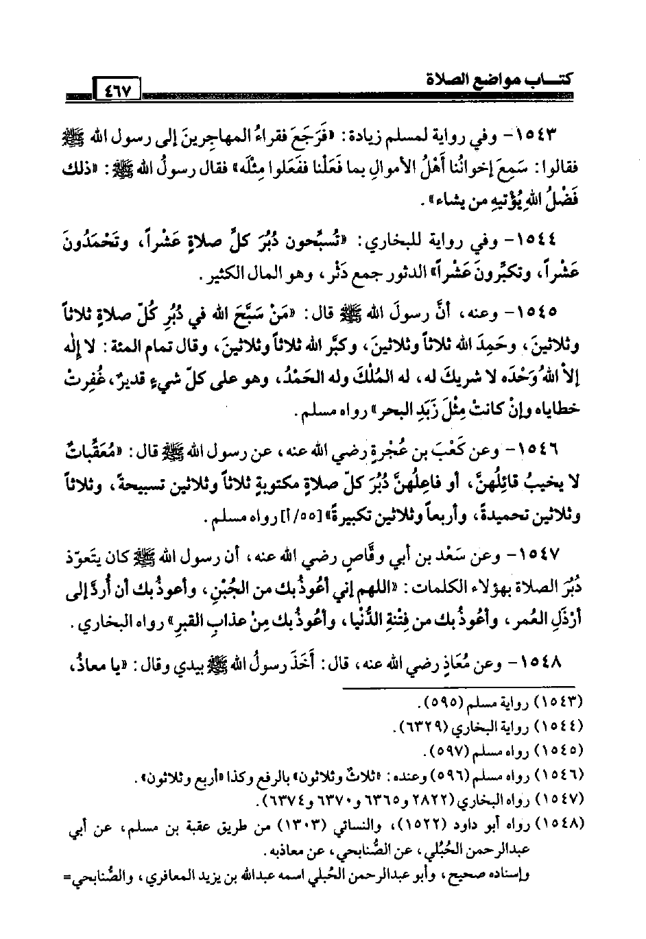 1546 - وَعَن كَعْب بن عجْرَة رَضِيَ اللَّهُ عَنْه، عَن رَسُول الله صَلَّى اللَّهُ عَلَيْهِ وَسَلَّم َ قَالَ: " مُعَقِّبَات لَا يخيب قائلهن، أَو فاعلهن دبر كل صَلَاة مَكْتُوبَة ثَلَاثًا وَثَلَاثِينَ تَسْبِيحَة، وَثَلَاثًا وَثَلَاثِينَ تَحْمِيدَة، وأربعاً وَثَلَاثِينَ تَكْبِيرَة " [55 / أ] رَوَاهُ مُسلم.