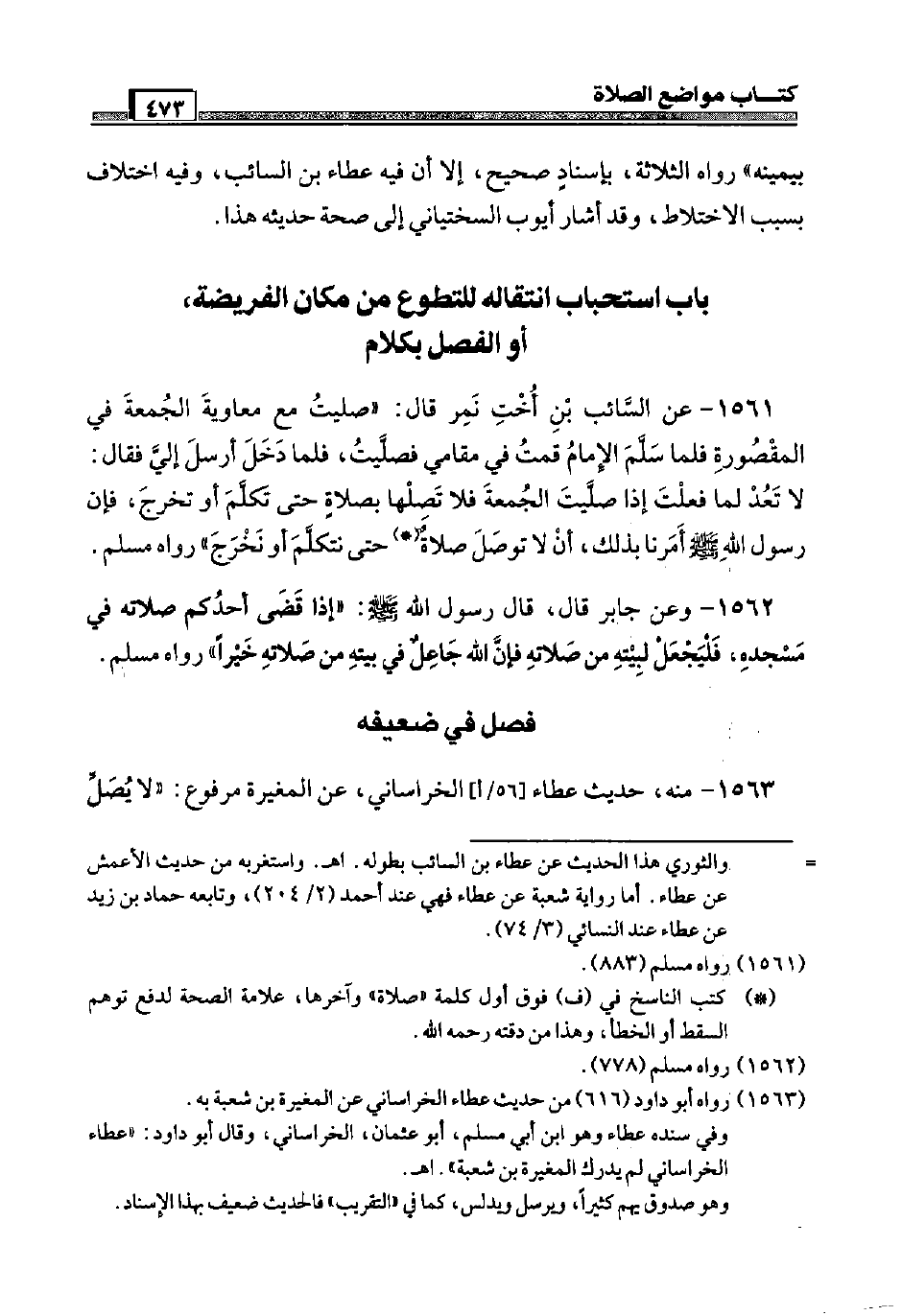 1561 - عَن السَّائِب بن أُخْت نمر قَالَ: " صليت مَعَ مُعَاوِيَة الْجُمُعَة فِي الْمَقْصُورَة فَلَمَّا سلم الإِمَام قُمْت فِي مقَامي فَصليت، فَلَمَّا دخل أرسل إِلَيّ فَقَالَ: لَا تعد لما فعلت إِذا صليت الْجُمُعَة فَلَا تصلها بِصَلَاة حَتَّى تكلم أَو تخرج، فَإِن رَسُول الله صَلَّى اللَّهُ عَلَيْهِ وَسَلَّم َ أمرنَا بذلك، أَن لَا توصل صَلَاة حَتَّى نتكلم أَو نخرج " رَوَاهُ مُسلم.