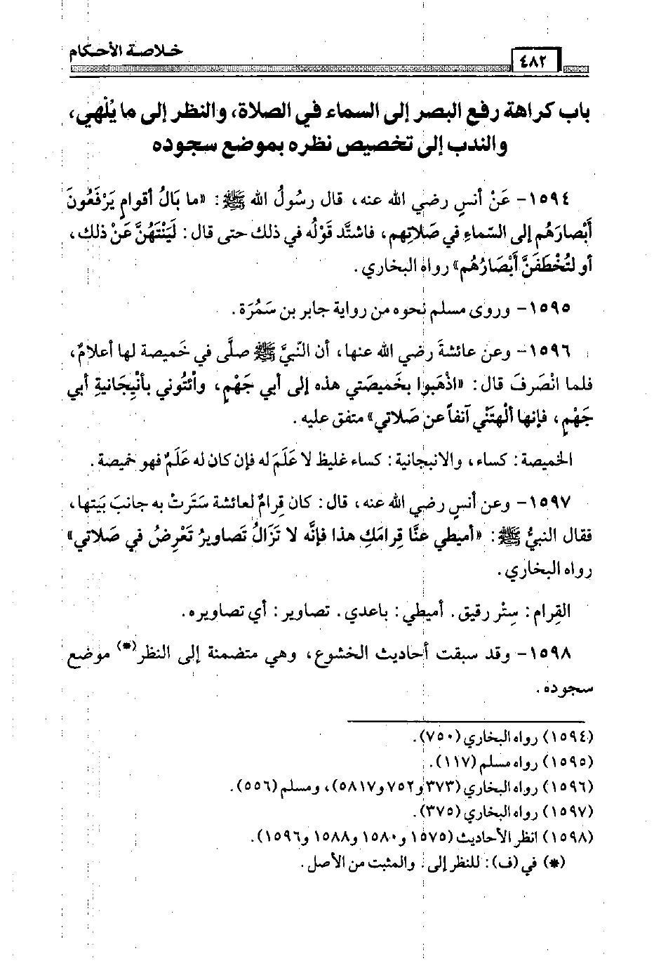 1598 - وَقد سبقت أَحَادِيث الْخُشُوع، وَهِي متضمنة إِلَى النّظر مَوضِع سُجُوده.