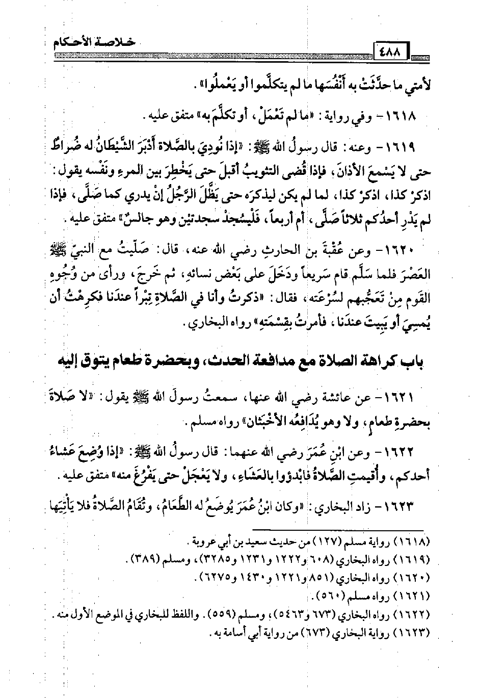 1623 - زَاد البُخَارِيّ: " وَكَانَ ابْن عمر يوضع لَهُ الطَّعَام، وتقام الصَّلَاة فَلَا يَأْتِيهَا
