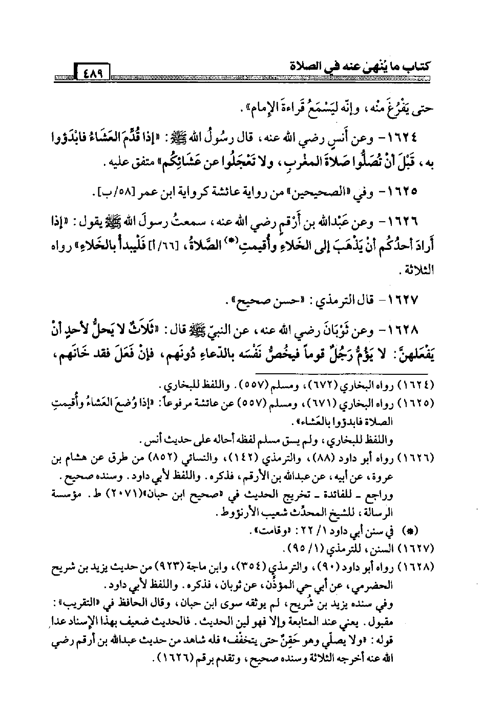 1626 - وَعَن عبد الله بن أَرقم رَضِيَ اللَّهُ عَنْه، سَمِعت رَسُول الله صَلَّى اللَّهُ عَلَيْهِ وَسَلَّم َ يَقُول: " إِذا أَرَادَ أحدكُم أَن يذهب إِلَى الْخَلَاء وأقيمت الصَّلَاة [66 / أ] فليبدأ بالخلاء " رَوَاهُ الثَّلَاثَة.