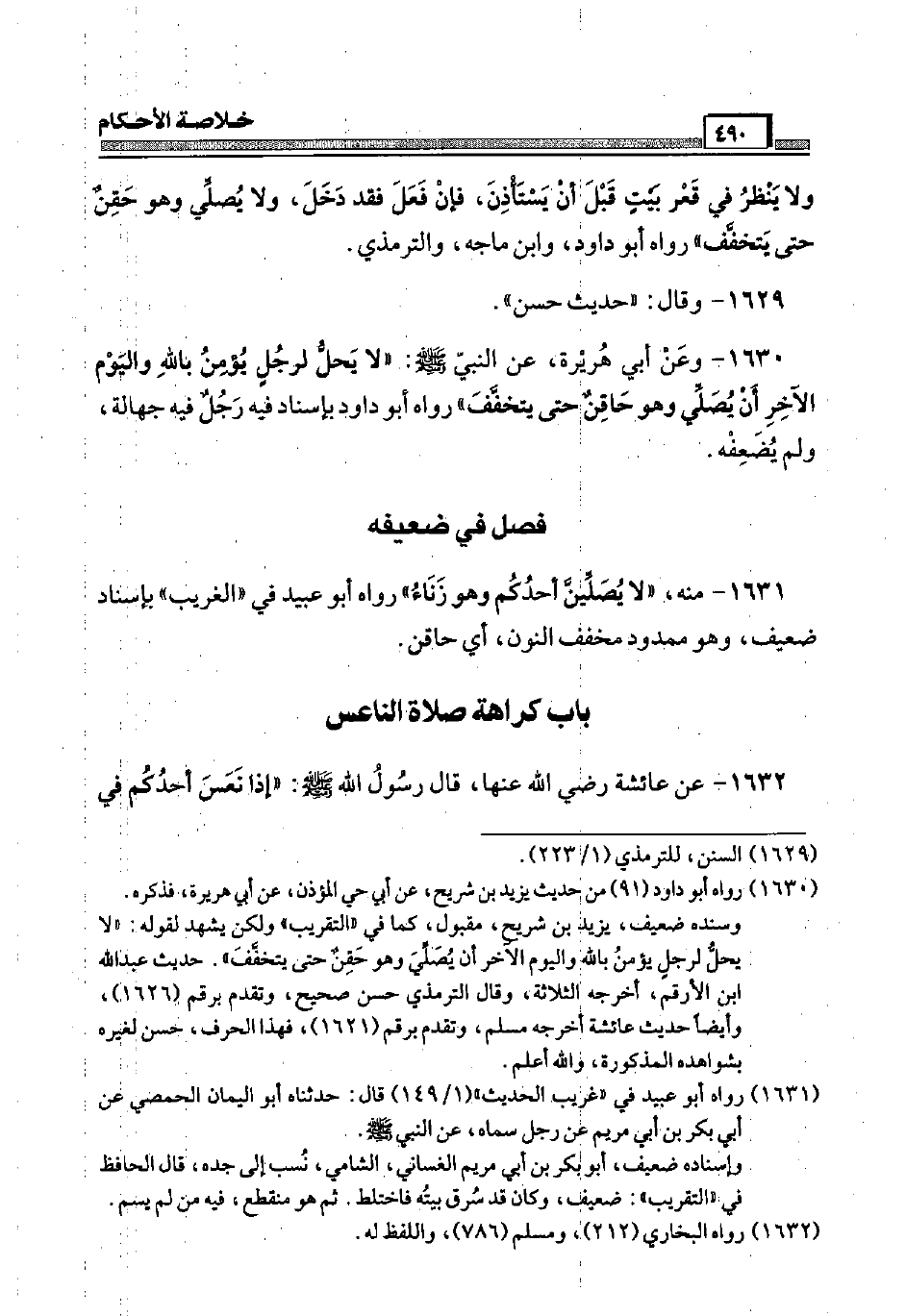 1630 - وَعَن أبي هُرَيْرَة، عَن النَّبِي صَلَّى اللَّهُ عَلَيْهِ وَسَلَّم َ: " لَا يحل لرجل يُؤمن بِاللَّه وَالْيَوْم الآخر أَن يُصَلِّي وَهُوَ حاقن حَتَّى يتخفف " رَوَاهُ أَبُو دَاوُد بِإِسْنَاد فِيهِ رجل فِيهِ جَهَالَة، وَلم يُضعفهُ.