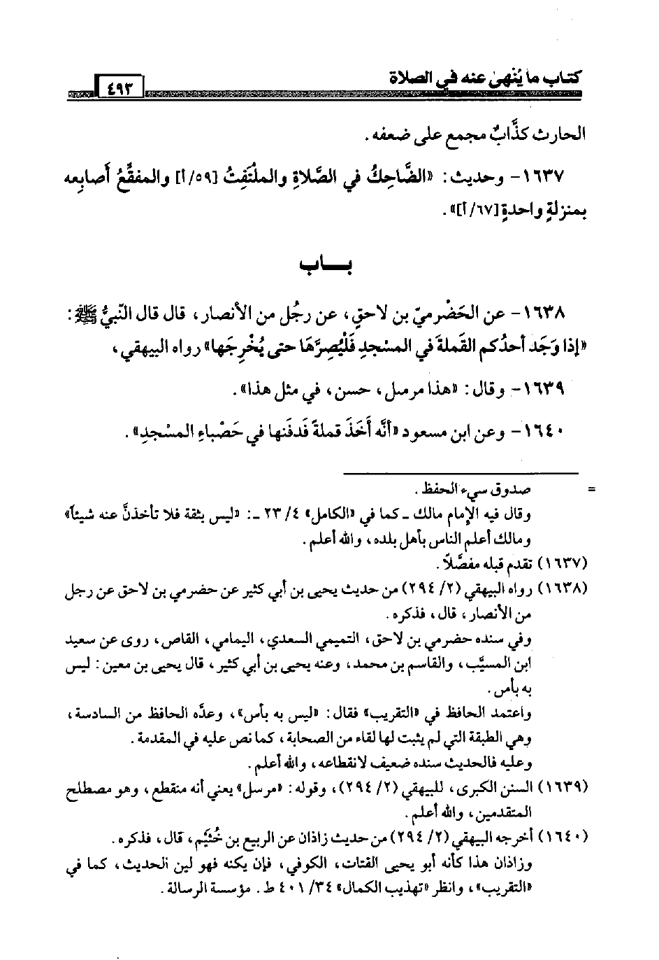 1638 - عَن الْحَضْرَمِيّ بن لَاحق، عَن رجل من الْأَنْصَار، قَالَ قَالَ النَّبِي صَلَّى اللَّهُ عَلَيْهِ وَسَلَّم َ: " إِذا وجد أحدكُم القملة فِي الْمَسْجِد فليصرها حَتَّى يُخرجهَا " رَوَاهُ الْبَيْهَقِيّ،