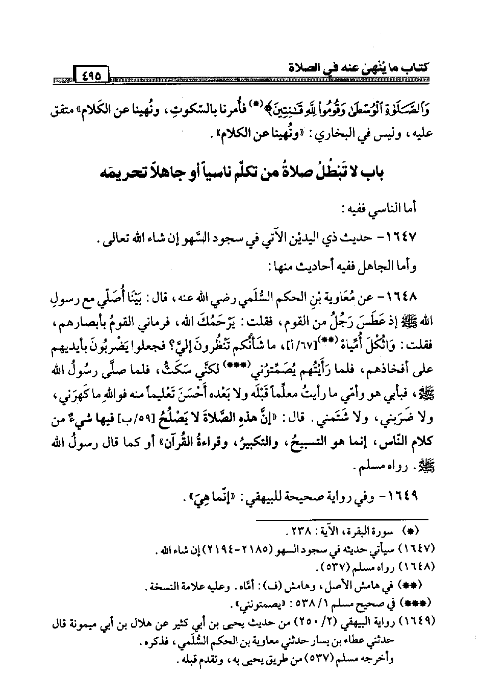 1648 - عَن مُعَاوِيَة بن الحكم السّلمِيّ رَضِيَ اللَّهُ عَنْه، قَالَ: بَينا أُصَلِّي مَعَ رَسُول الله صَلَّى اللَّهُ عَلَيْهِ وَسَلَّم َ إِذْ عطس رجل من الْقَوْم، فَقلت: يَرْحَمك الله، فَرَمَانِي الْقَوْم بِأَبْصَارِهِمْ، فَقلت: واثكل أمِّياه [67 / 26 / أ] ، مَا شَأْنكُمْ تنْظرُون إِلَيّ؟ فَجعلُوا يضْربُونَ بِأَيْدِيهِم عَلَى أَفْخَاذهم، فَلَمَّا رَأَيْتهمْ يُصمتُونِي لكني سكت، فَلَمَّا صَلَّى رَسُول الله صَلَّى اللَّهُ عَلَيْهِ وَسَلَّم َ، فبأبي هُوَ وَأمي مَا رَأَيْت معلما قبله وَلَا بعده أحسن تَعْلِيما مِنْهُ فوَاللَّه مَا كَهَرَنِي، وَلَا ضَرَبَنِي، وَلَا شَتَمَنِي. قَالَ: " إِن هَذِه الصَّلَاة لَا يصلح [59 / ب] فِيهَا شَيْء من كَلَام النَّاس، إِنَّمَا هُوَ التَّسْبِيح، وَالتَّكْبِير، وَقِرَاءَة الْقُرْآن " أَو كَمَا قَالَ رَسُول الله صَلَّى اللَّهُ عَلَيْهِ وَسَلَّم َ. رَوَاهُ مُسلم.